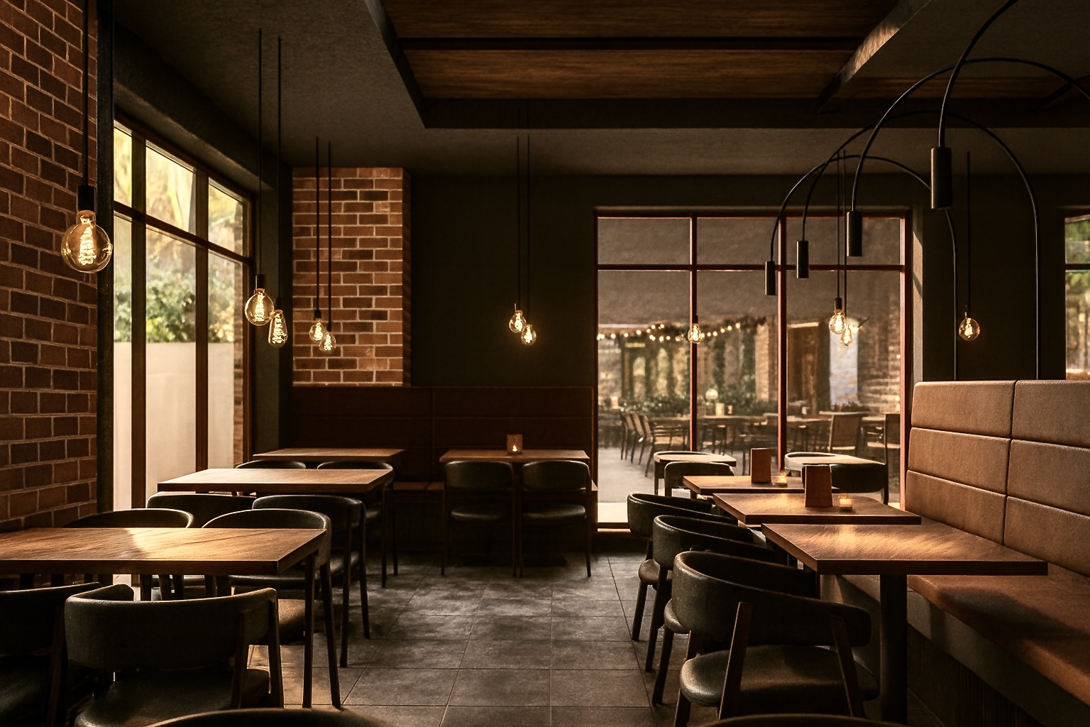 keep the exact architecture layout furniture placement and camera angle of the original image do not redesign the space convert the image into an ultra photorealistic architectural interior photograph eliminate the cgi rendering look introduce natural imperfections and real world material behavior subtle dust fingerprints on glass micro scratches on wood and metal slight texture irregularities realistic wood grain variation and minor wear improve lighting to physically accurate photographic lighting warm restaurant ambient lighting combined with natural daylight entering from the windows soft shadows natural light falloff and realistic reflections apply professional camera characteristics shallow depth of field subtle lens distortion slight chromatic aberration film grain natural exposure and hdr dynamic range the result should look indistinguishable from a real high end architectural photograph shot by a professional photographer using a full frame camera and a 35mm lens extremely realistic cinematic interior photography ultra detailed 8k resolution make the image indistinguishable from a real photograph not a 3d rendering