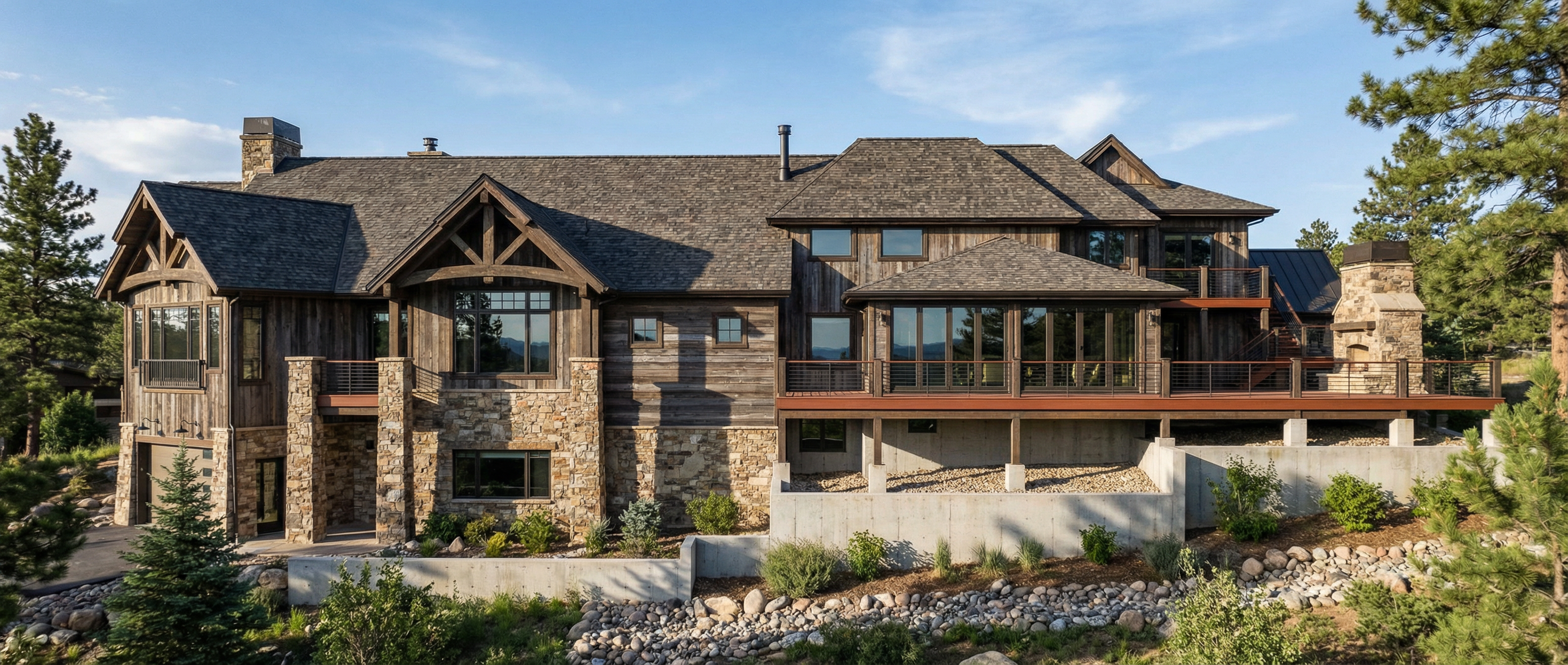 you are a professional image renderer you create the highest grade renderings around and specialize in architectural renderings this is the front elevation of a house create a high resolution photorealistic image of this structure keep the windows as they are where they are keep the doors as they are where they are keep the main structure as it is where it is feel free to change the perspective keep the roofline as it is where is it do not add anything to the structure that i have not asked for the driveway enters in the center of the front elevation and turns to the left garage wing of the house the background will be a property that backs up to a texas lake it should be early afternoon with a bright sunny day clear skies the landscaping should be late summer with color and should be that of a luxury estate