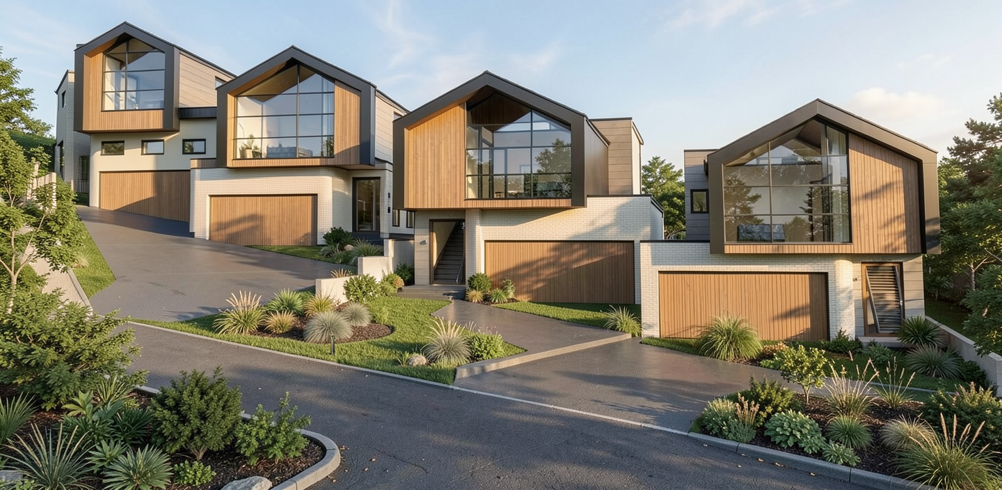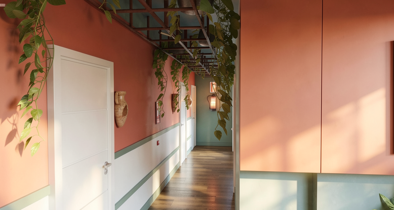 replace the back wall with a full width full height black aluminum glass wall in four equal sections replace the visible windows with matching black aluminum windows with muntin divisions apply warm clay plaster to the walls and ceiling and bologna microcement by solo gietvloeren to the floor keep the layout furniture proportions lighting direction and all other elements unchanged