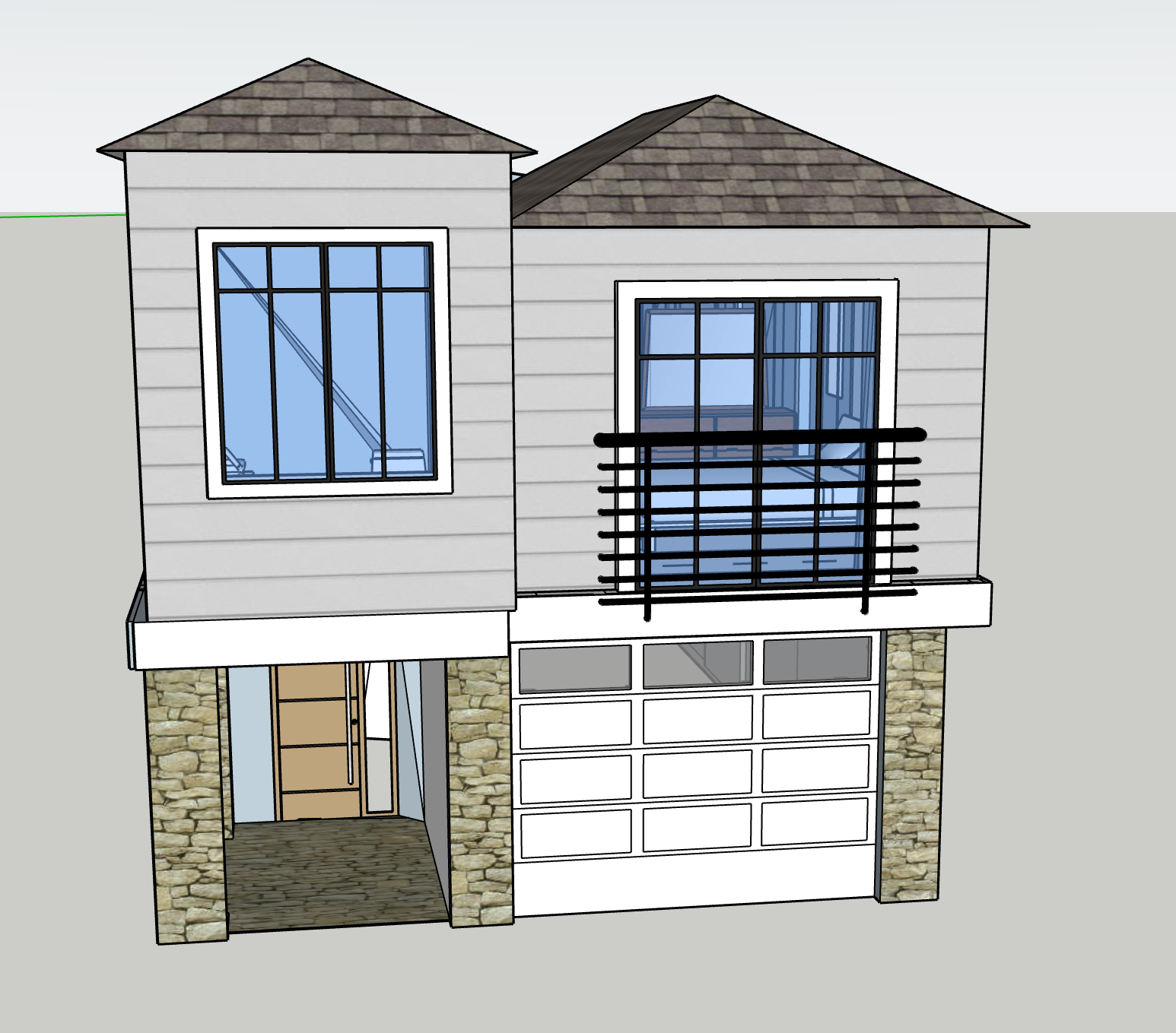 a modern two story house with a garage featuring light white horizontal siding and a black metal balcony railing the roof is covered with ashalpt shingle gray shingles the large windows have black frames while the entrance features a wooden door set between rustic stone columns the garage door solid white with clear glass above frosted upper windows the house is in redondo beach ca the ground level is paved with natural stone soft morning light casts a warm glow creating a welcoming and cozy atmosphere enhancing the natural tones and modern design of the house architecture