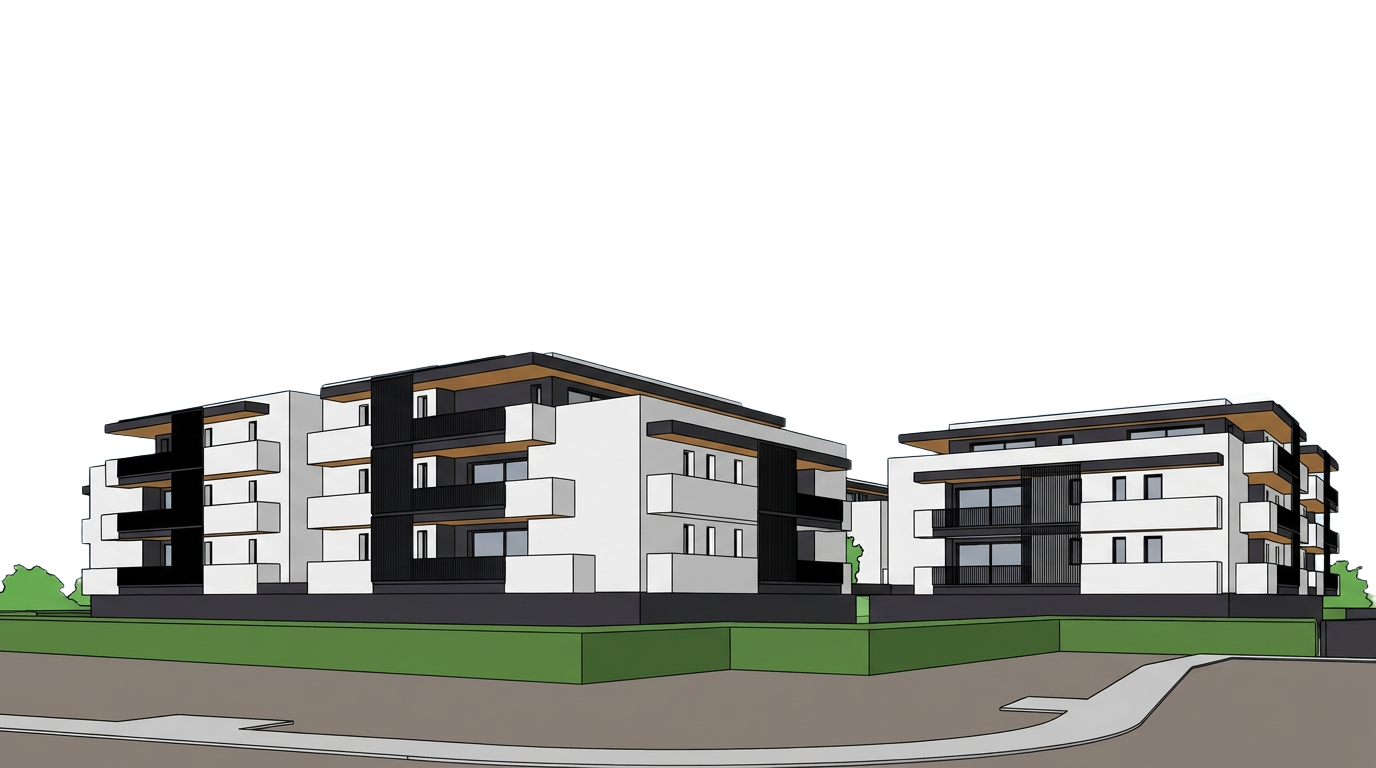 edificio residenziale giornata estiva di luglio ore 12 fai in intonaco bianco le parti bianche mentre quelle piu scure in testa di moro scuro parapetti in metallo testa di moro siepe in verde del lotto in verde di gelsomino in primo piano parco pubblico con piccoli arbusti e vialetto in ghiaino non modificare la posizione della telecamera non modificare l edificio