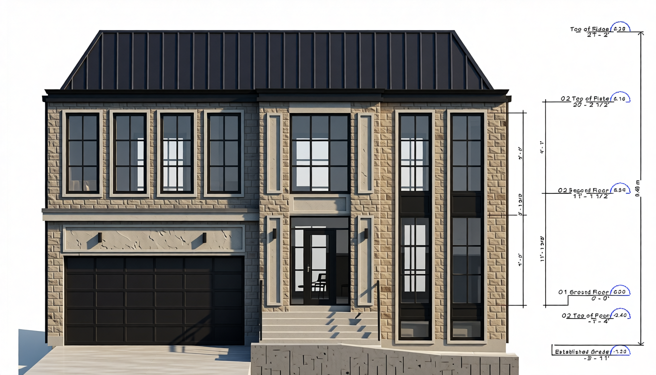 use smooth white indiana limestone for the facade black metal roof use realistic landscaping show driveway