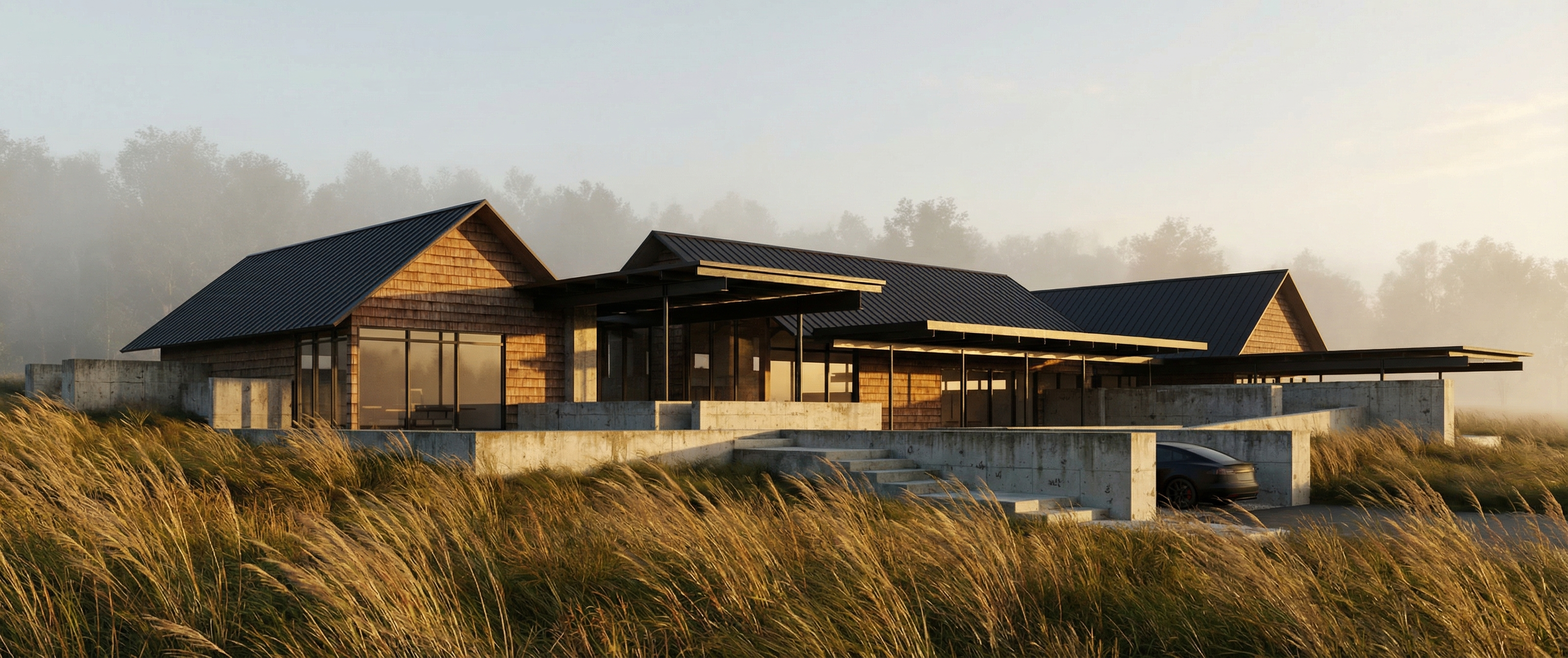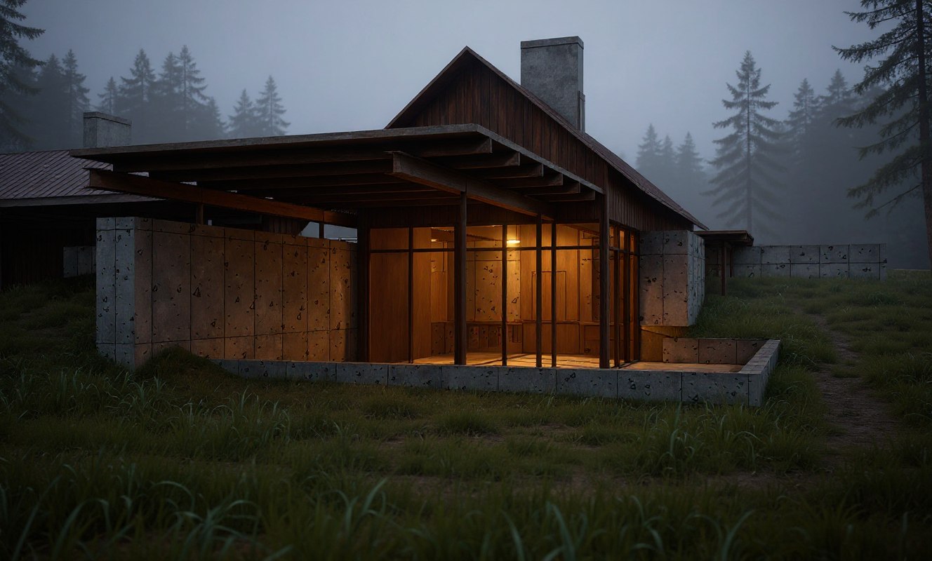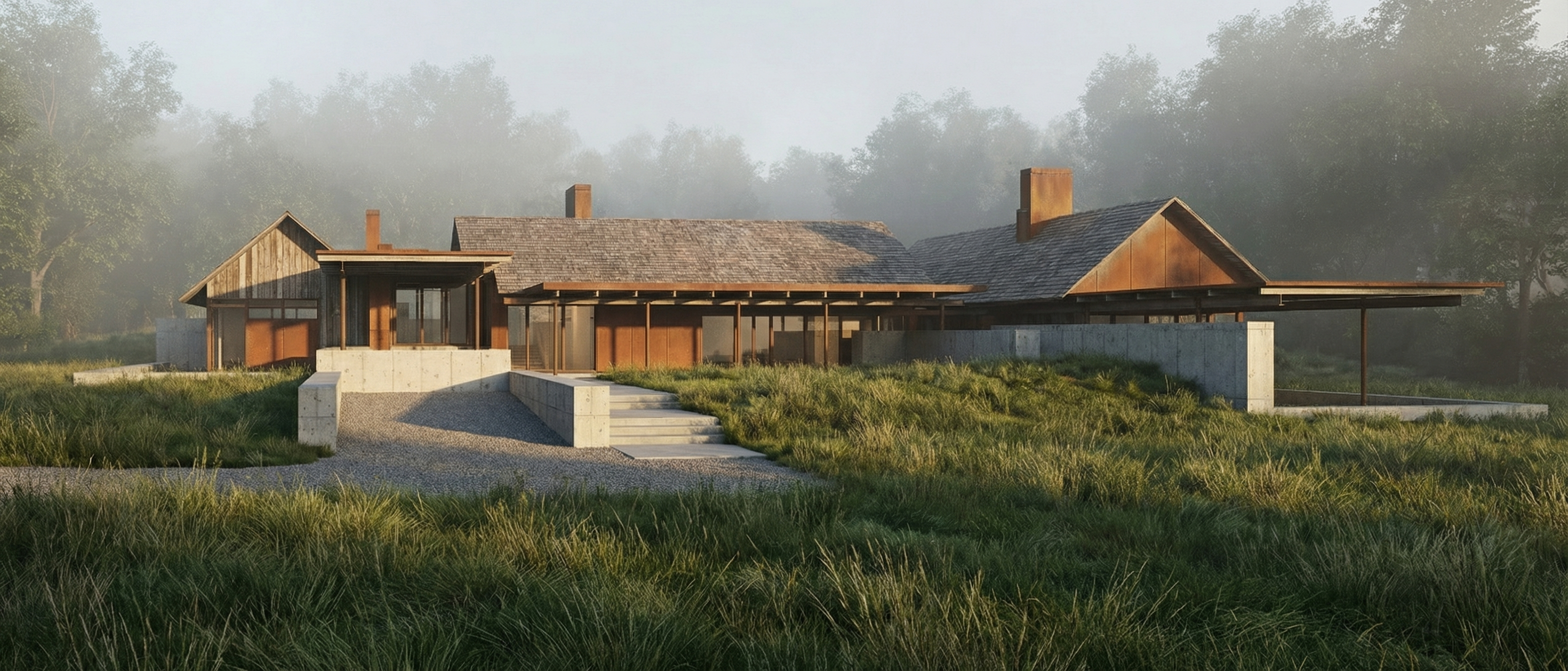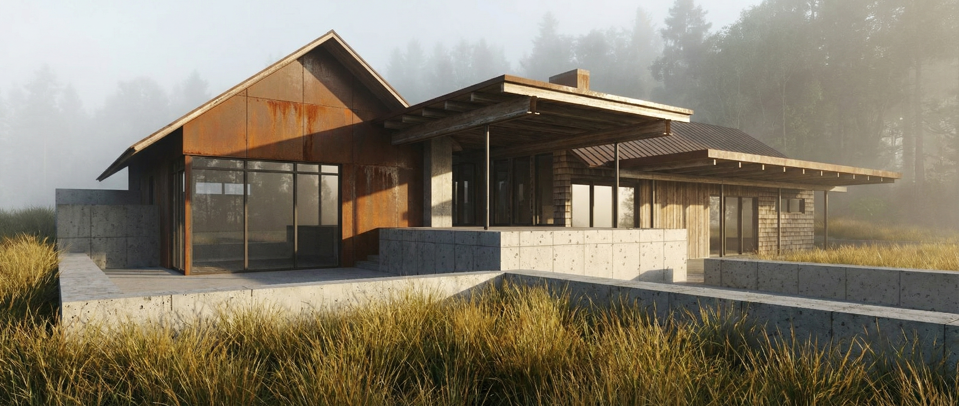 corten steel panels rustic wood shiplap siding concrete accent walls sunlight on building face tall grass in foreground fog trees in background interior lighting