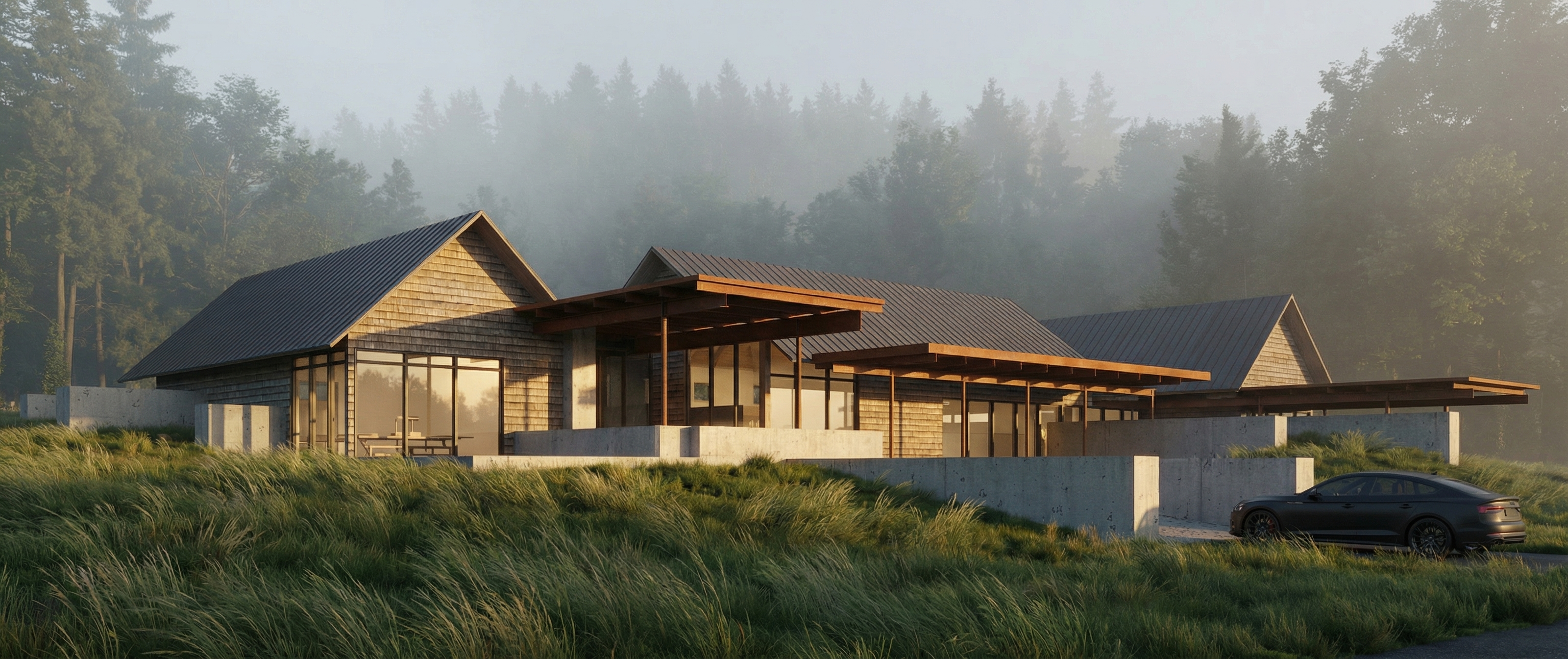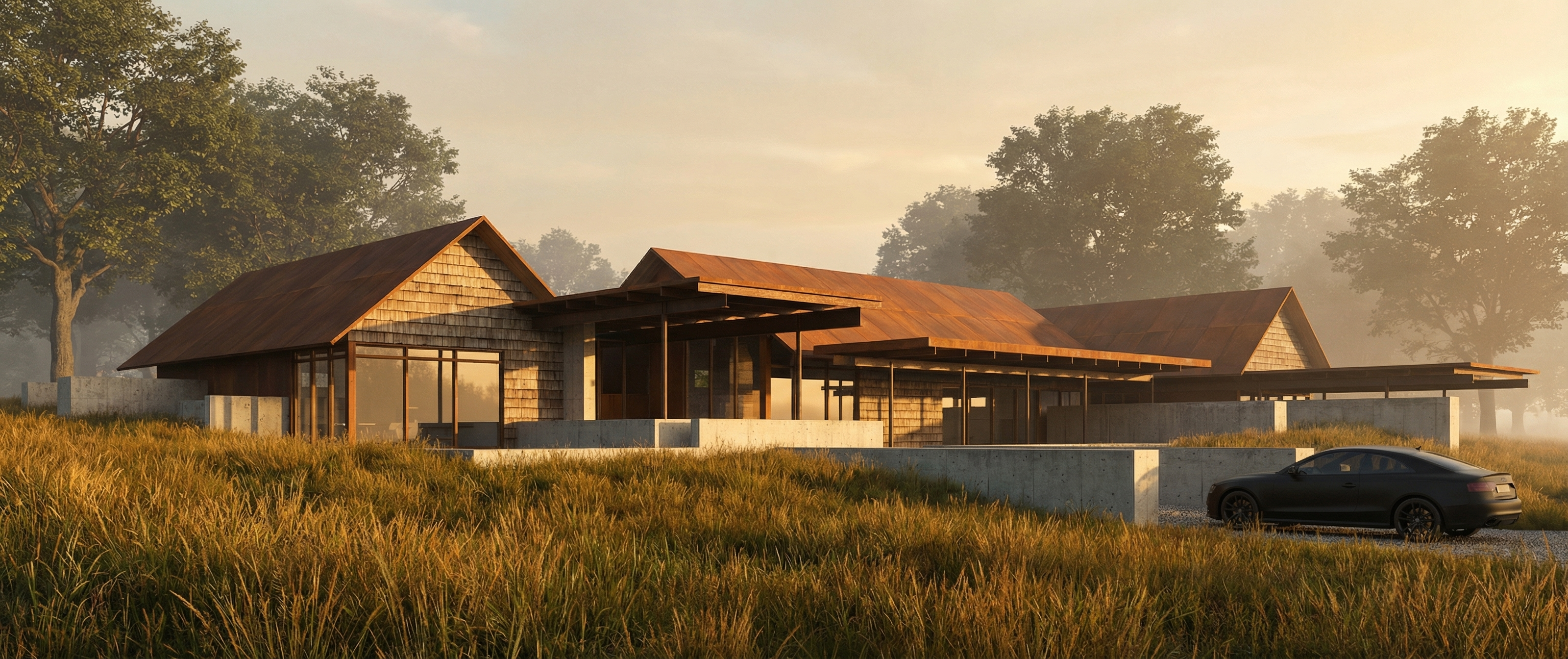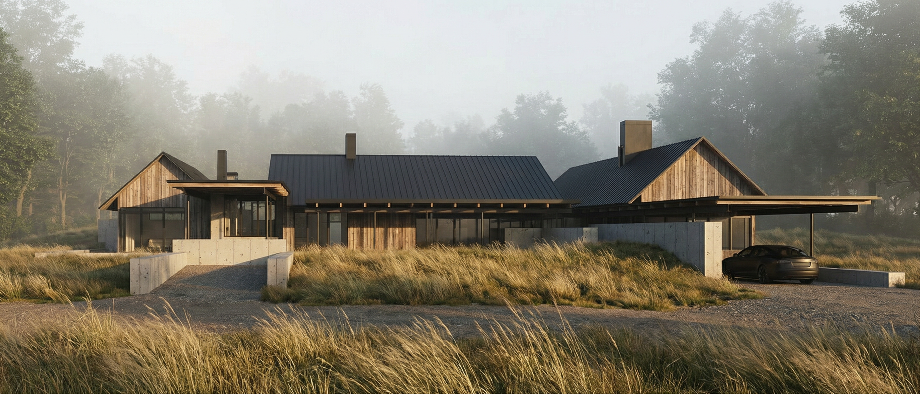 corten steel panels rustic wood shiplap siding concrete accent walls sunlight on building face tall grass in foreground fog trees in background interior lighting