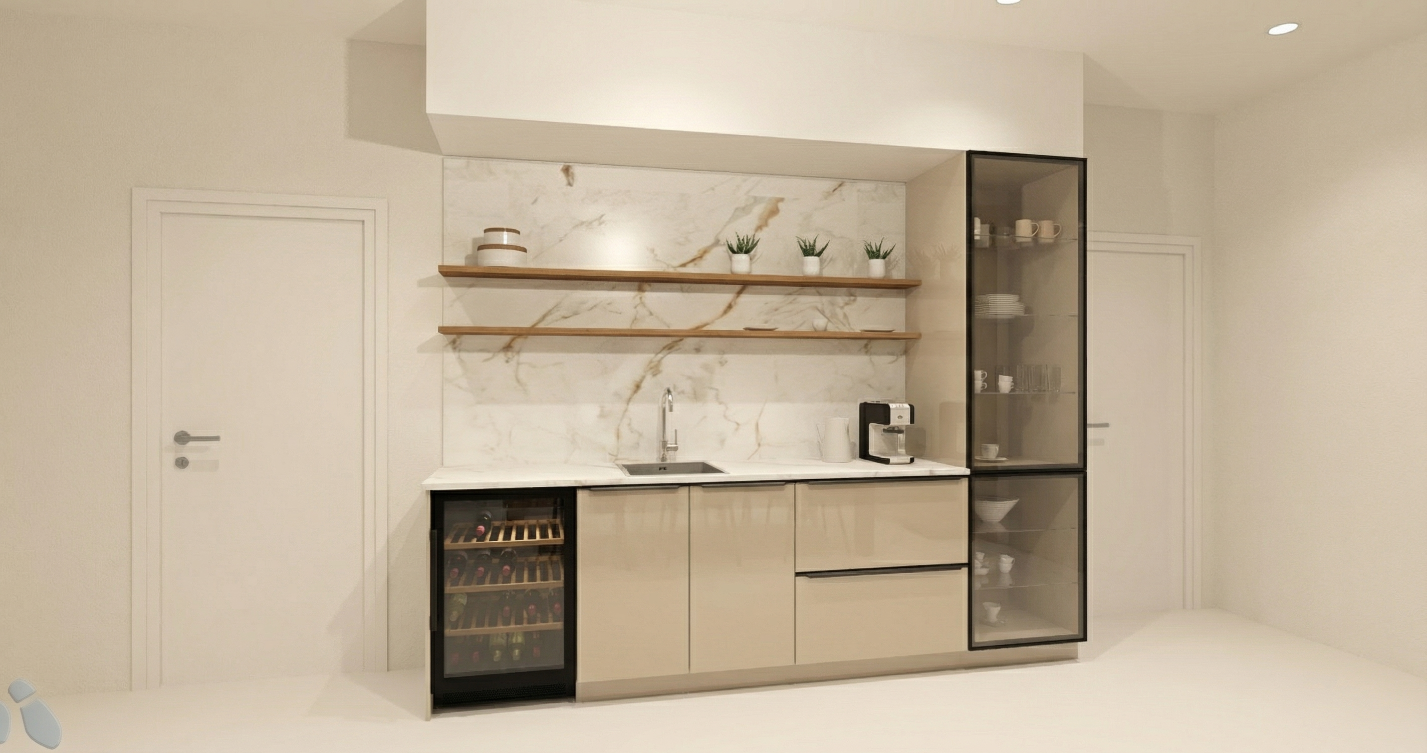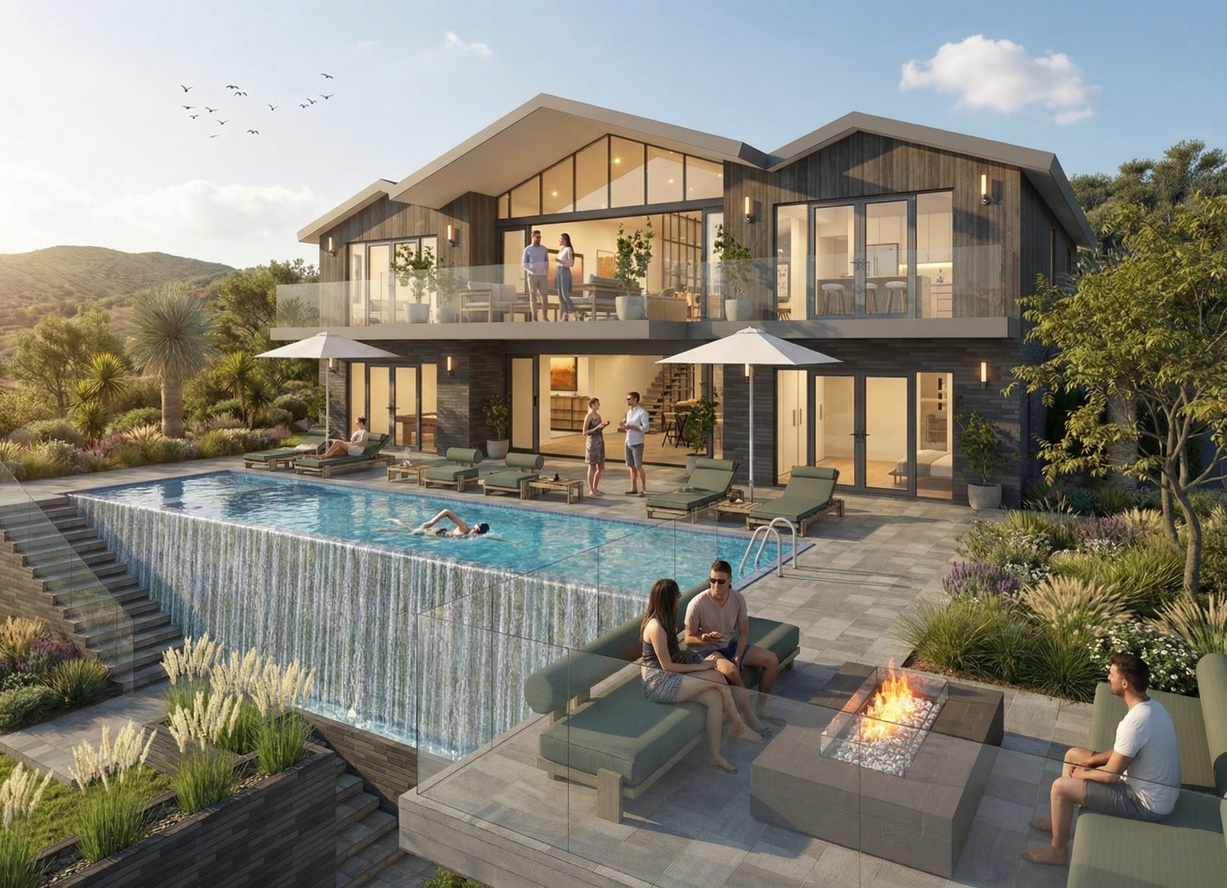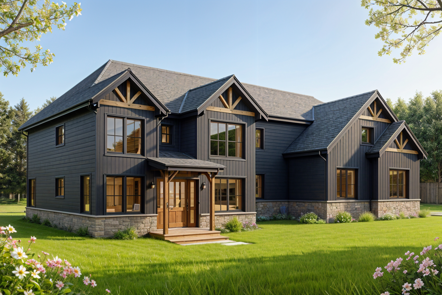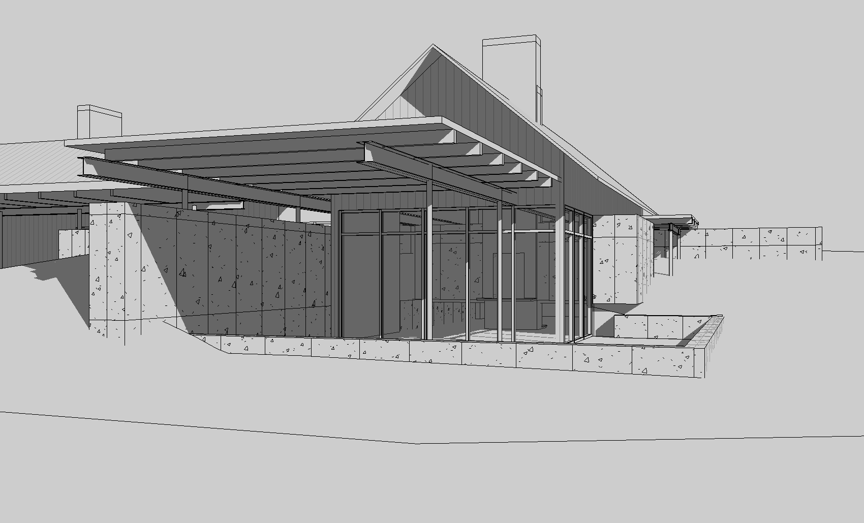 corten steel panels rustic wood shiplap siding concrete accent walls sunlight on building face tall grass in foreground fog trees in background interior lighting