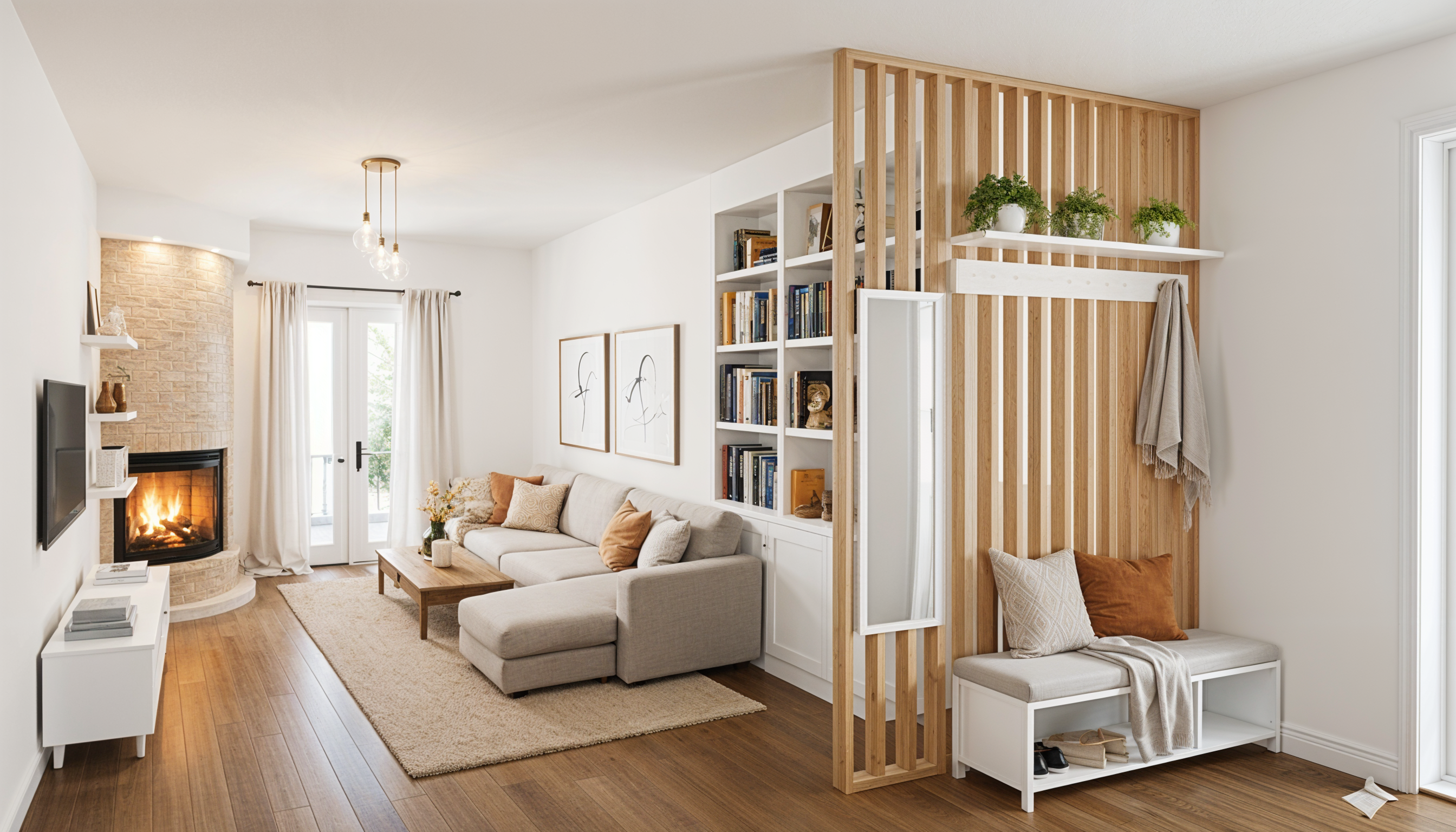 create a cozy modern living room with a warm and inviting atmosphere include a beige sectional sofa adorned with soft rust colored and patterned pillows add a light wooden floor and a shaggy cream colored area rug incorporate a wooden coffee table in the center and a white wall mounted tv unit feature a corner fireplace with light brick housing a lively fire add white curtains framing tall windows that brighten the room with natural light integrate a white shelf with decorative items above the fireplace incorporate a wooden slatted room divider with green potted plants on top include a white storage bench with gray cushions near the divider accented with more pillows and a soft throw add a touch of elegant simplicity with minimalistic line art on the walls the overall color scheme should be neutral with pops of warm earthy tones