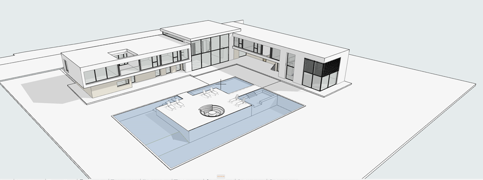 modernist exterior shot keep the full size image basamento in materiale gres colore beige riporta esattamente il volume interrato circolare nella piattaforma dentro la piscina architecture
