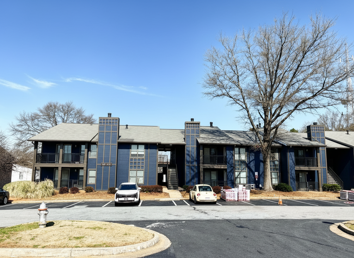 keep building geometry the same do not change view remove cars and other items in the foreground show new asphalt paved parking lot show lush green landscaping native to atlanta ga in the summer