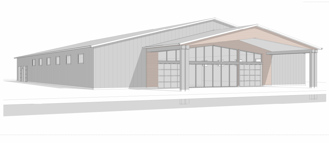 exterior nighttime architectural rendering same modern building perspective extend front window width apply warm wood material to structural beams under the awning add stone platform base under support posts use black wood cladding on all walls and surround front facing windows with 18 inch protruding stone cladding add a wood beam running along underside of awning include soft landscaping and plants for realism illuminate with subtle ambient glow and vertical linear accent lights flanking both sides of the main window interior should emit warm lighting through the large windows add vintage cars outside and inside human figures for scale and reflections of light on glass and metal surfaces architecture