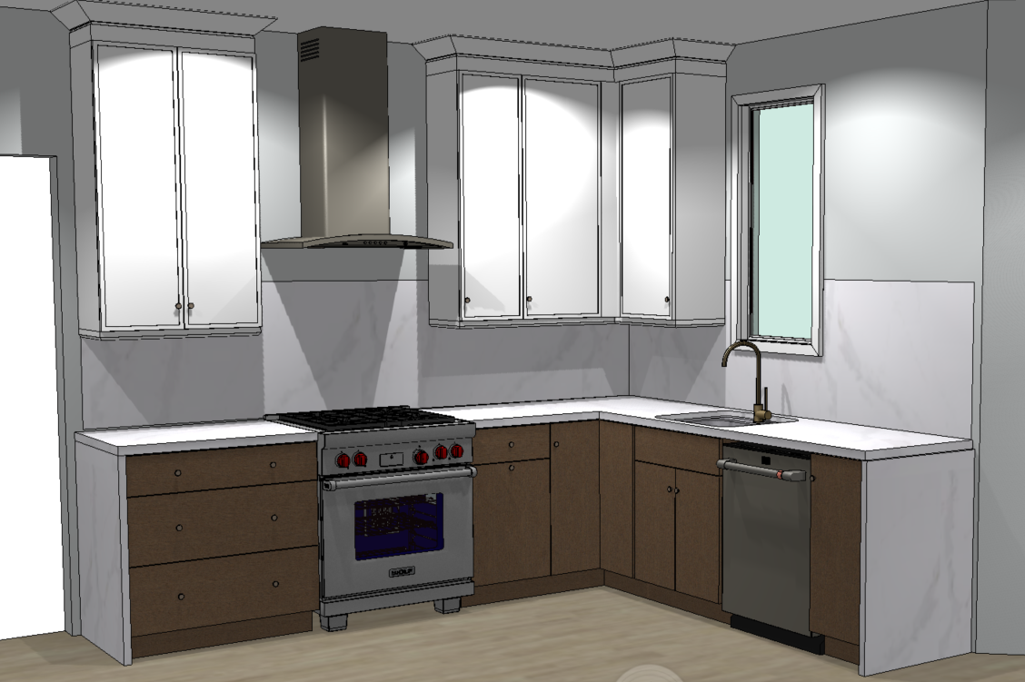 create a realistic and beautifully rendered image of a classic kitchen the wall cabinets are classic white skinny shaker reflecting a soft light the countertops are a polished white marble with subtle gray veining the cabinetry on the bases is finished in a muted maple no grain with warm grey and caramel tones enhanced by under cabinet lighting that casts a gentle glow the range and hood has a sleek stainless steel finish adding a contemporary touch the walls are painted in a soft dove white creating a calm and inviting atmosphere the overall lighting is warm and ambient evoking a cozy and elegant atmosphere