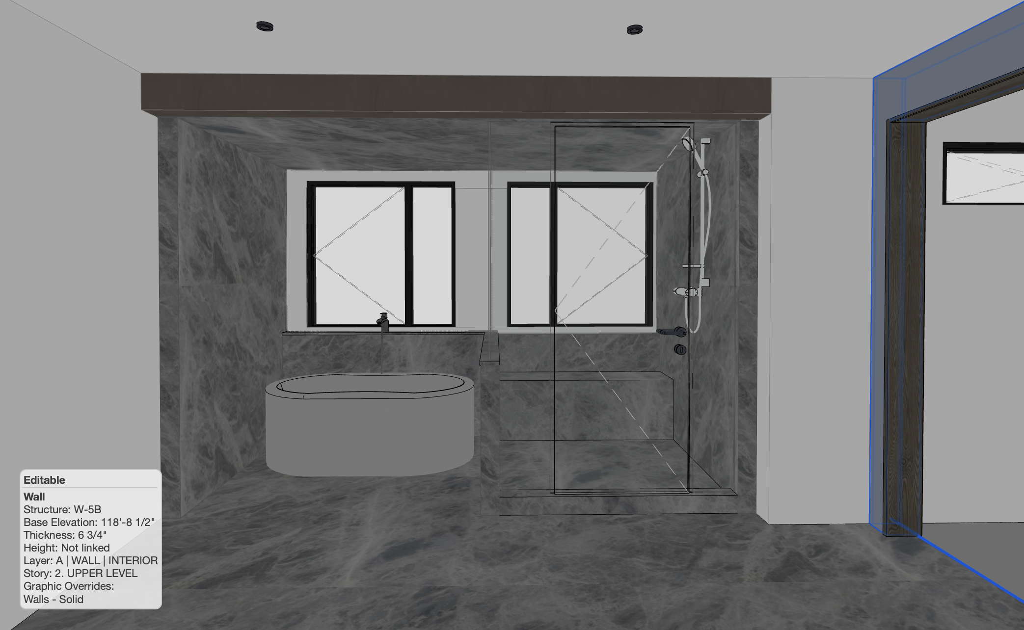 use grigio toscana for the wall and floor tiles use very light grey plaster for the walls use black plumbing fixtures use whitewash oak for all the wood