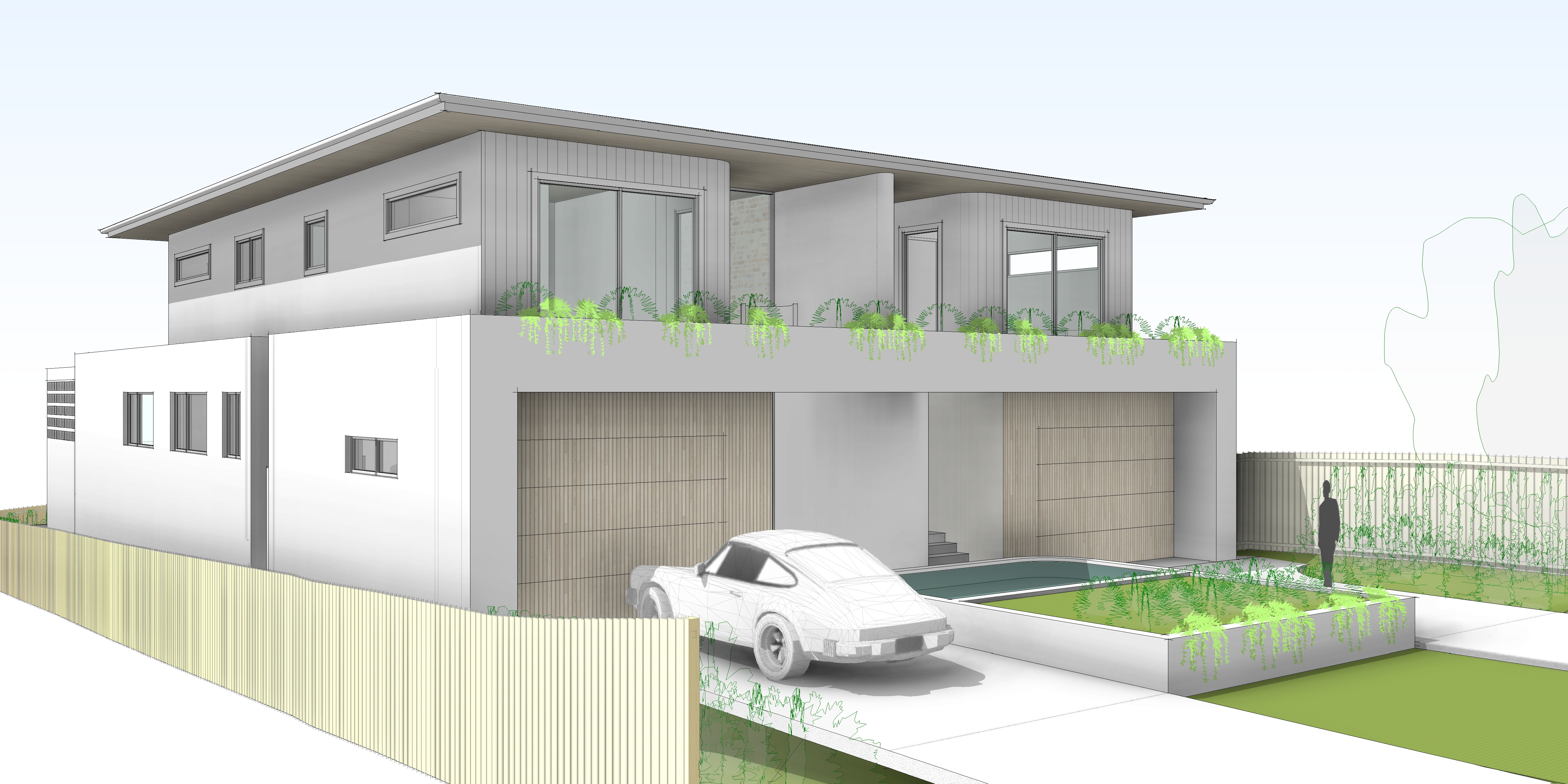 render a photorealistic 3d perspective of this house in italy reference the current material style just enhance them vertical panel siding rendered walls keep model geometry exactly the same windows doors roof walls garage door pavement driveway make a lush vegetation that looks native to italy do not change the view only enhance the current materials and make the landscape nicer vegetation detailed textures in pond and glass reflections and a vibrant clear sky with light atmospheric depth render in hyper realistic architectural visualization quality 8k resolution