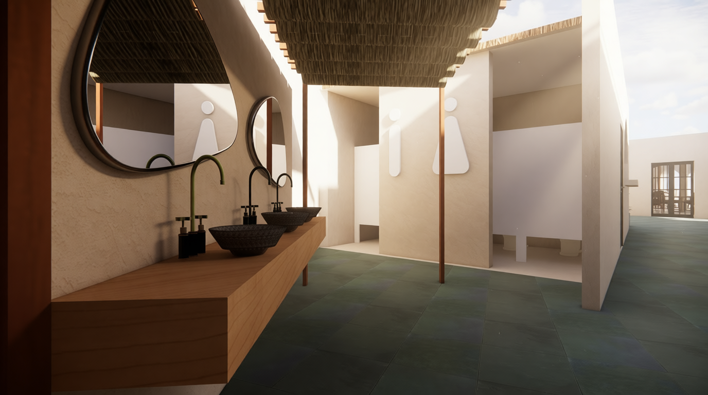 render a cozy countryside house with a warm inviting atmosphere the roof should be a rich earthy brown complementing the wooden porch and railings in a natural oak color the walls are a soft olive green while the chimney is textured with rustic stone in shades of grey and black the front porch suggests a welcoming space surrounded by lush greenery and flowers in bloom the lighting is soft and golden evoking a peaceful sunset ambiance with a clear sky above shadows gently highlight the architectural features creating depth and warmth