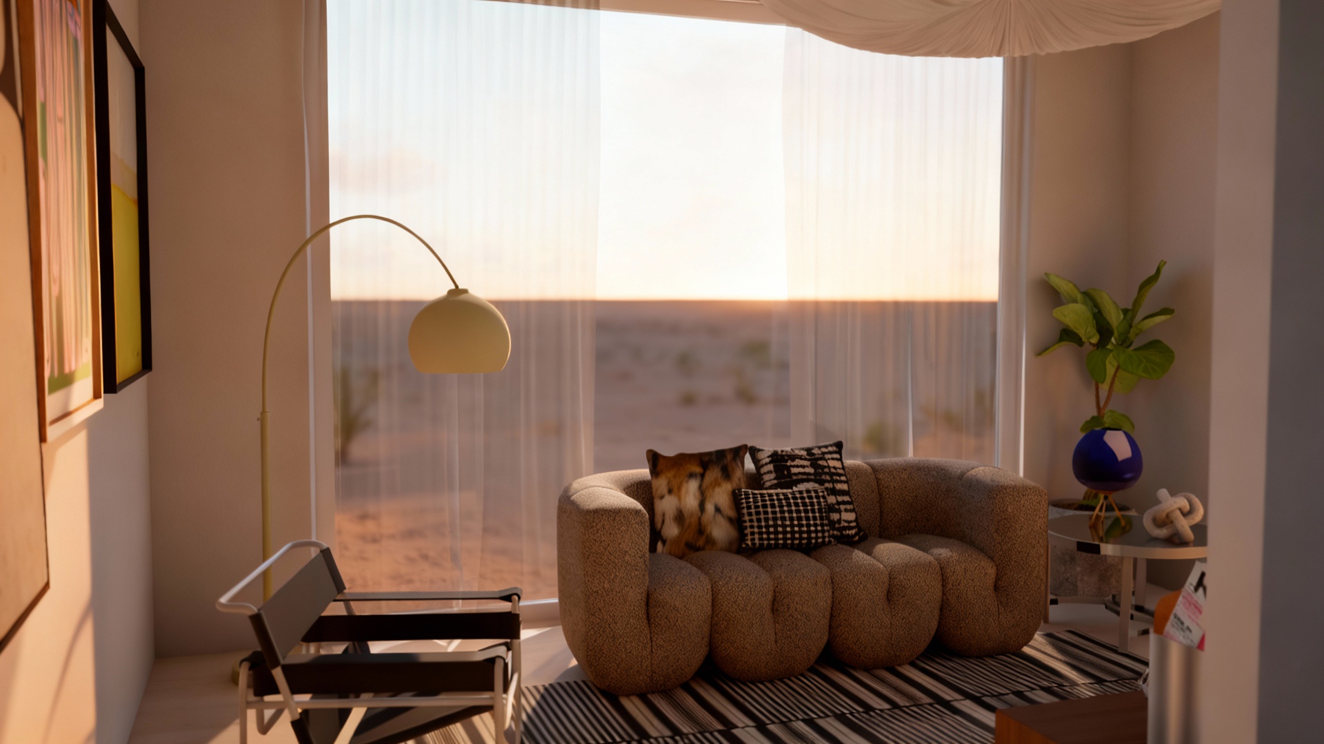 make night time with fixtures lit up blue light on that s on the side table and the floor lamp turned on orange