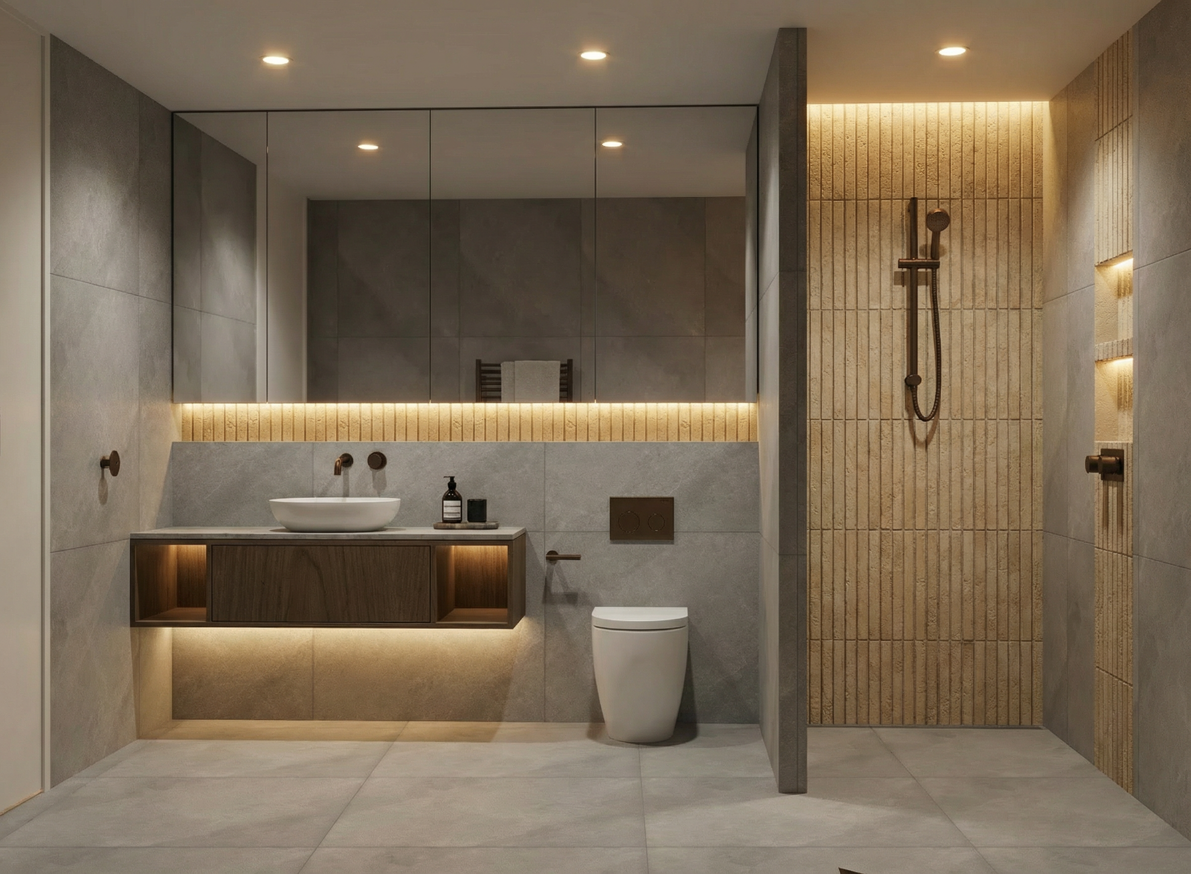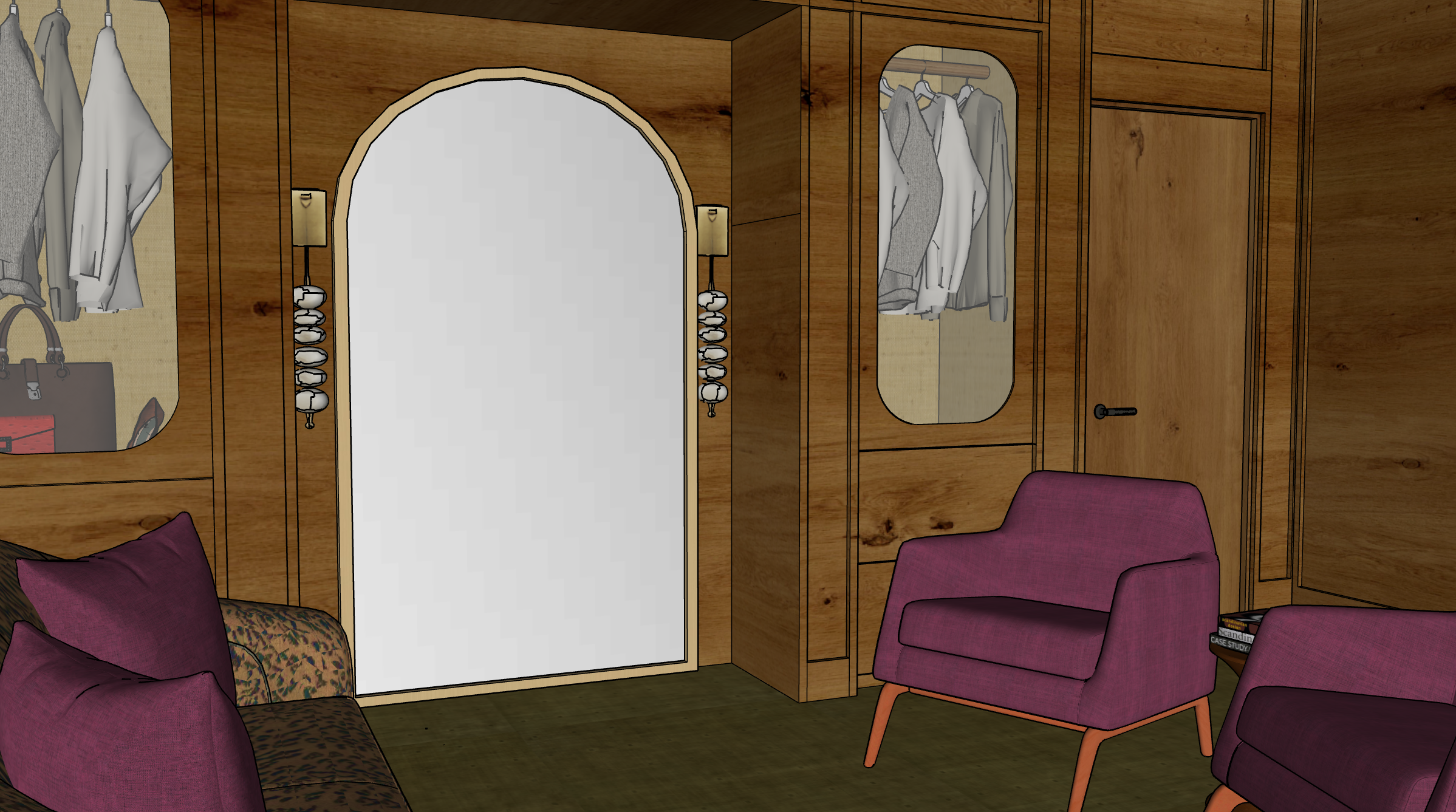 create a cozy and elegant room interior use rich wooden textures for walls cabinets and doors with a warm dark oak finish include a large arched mirror with a gentle golden frame feature modern wall sconces with a soft cream light add plush armchairs in a deep plum color to exude a sense of luxury and comfort the sofa should have cushions in the same plum shade with a subtle sophisticated floral pattern incorporate muted natural colors for the clothes visible in the mirrored wardrobe suggesting luxury aim for a warm welcoming atmosphere with a touch of sophistication