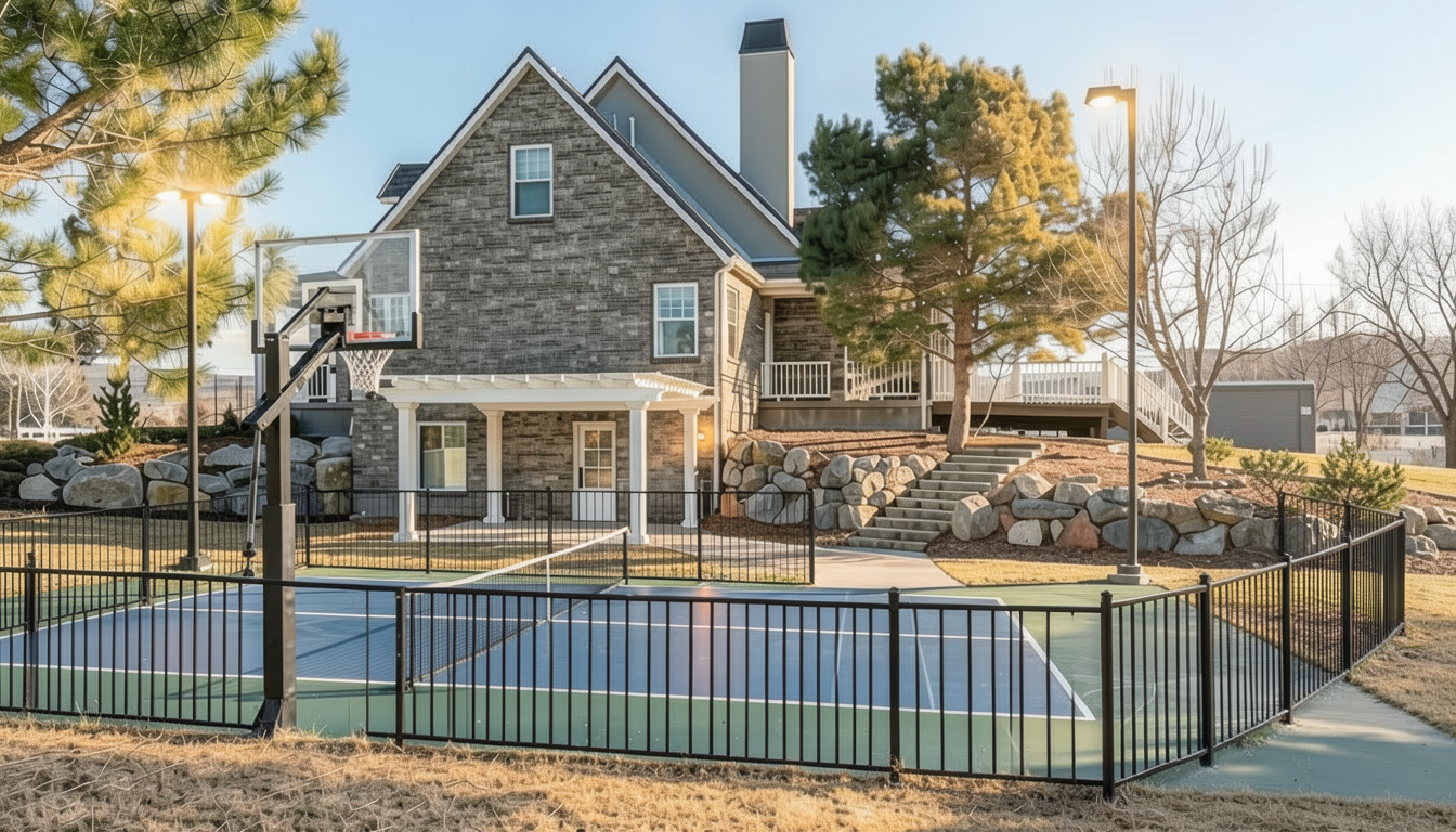 add a black ball fence around the court except for where the concrete comes into the court on the edge of the green
