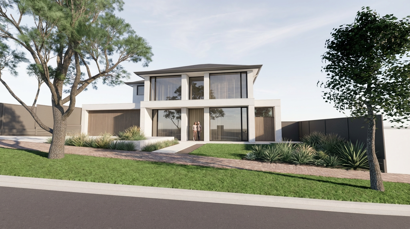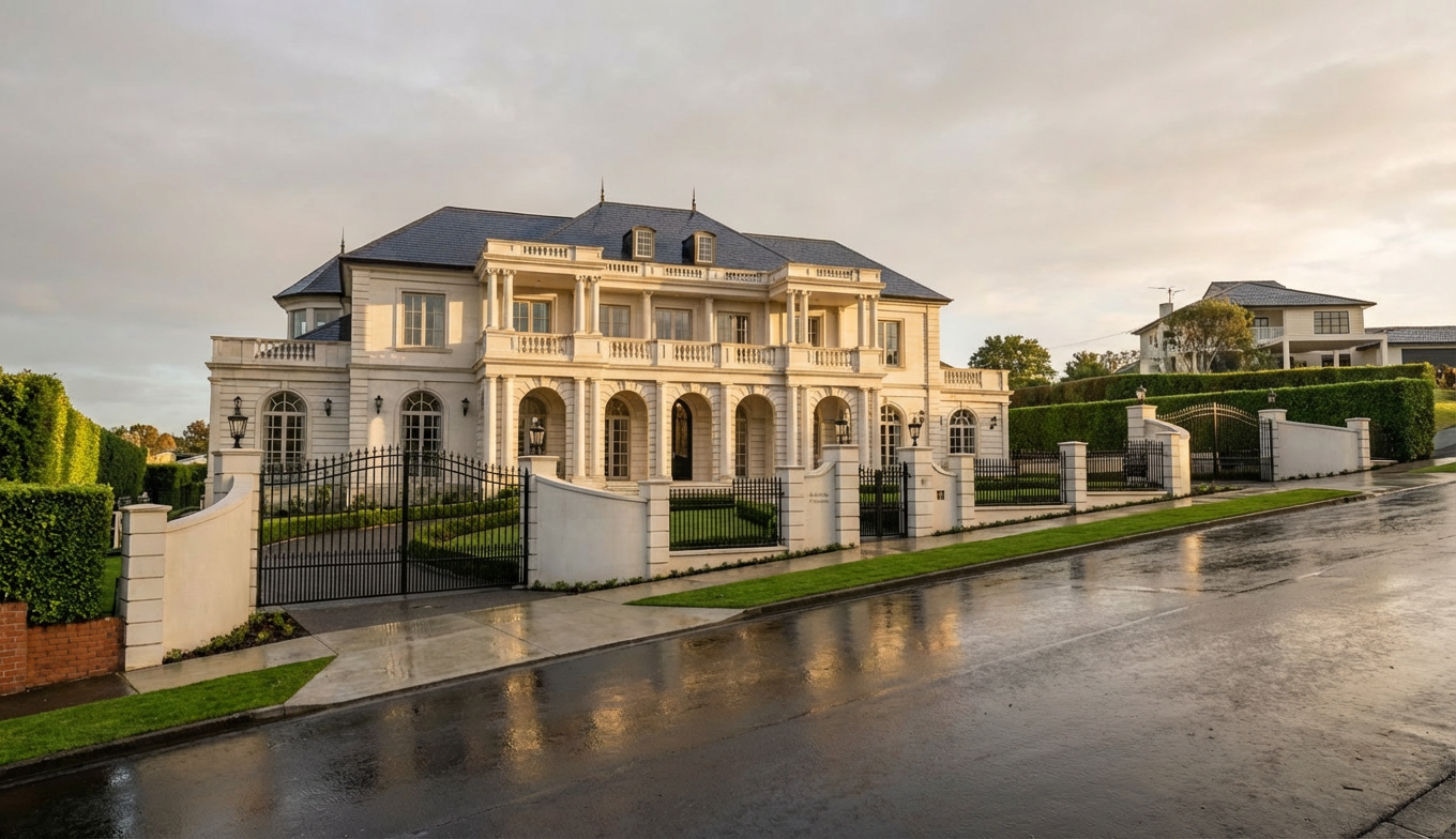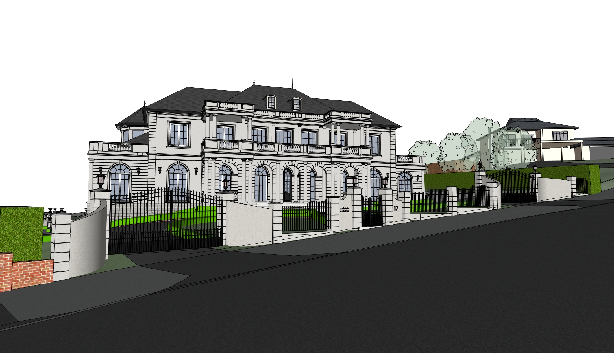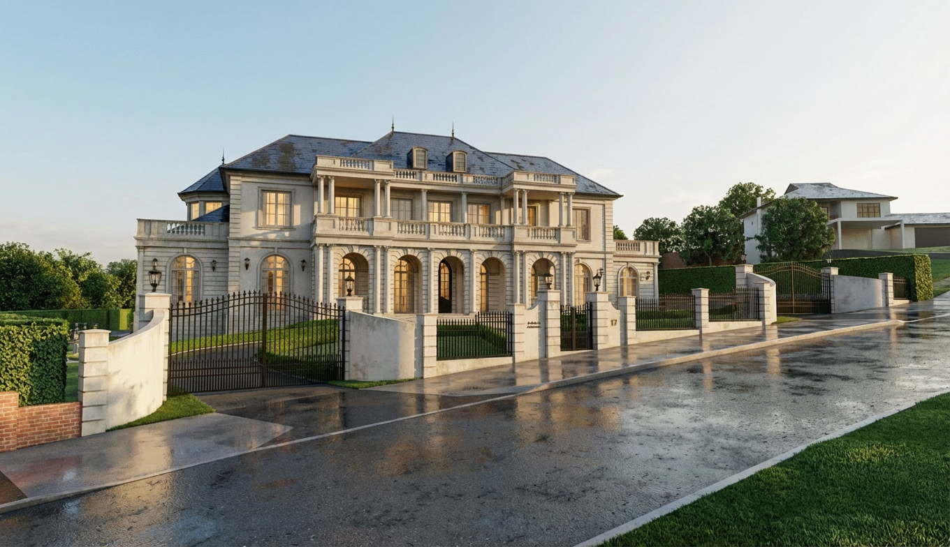 photorealistic render classical home high green hedges fence award winning off white window frame in the late afternoon wet slate roofing wet road