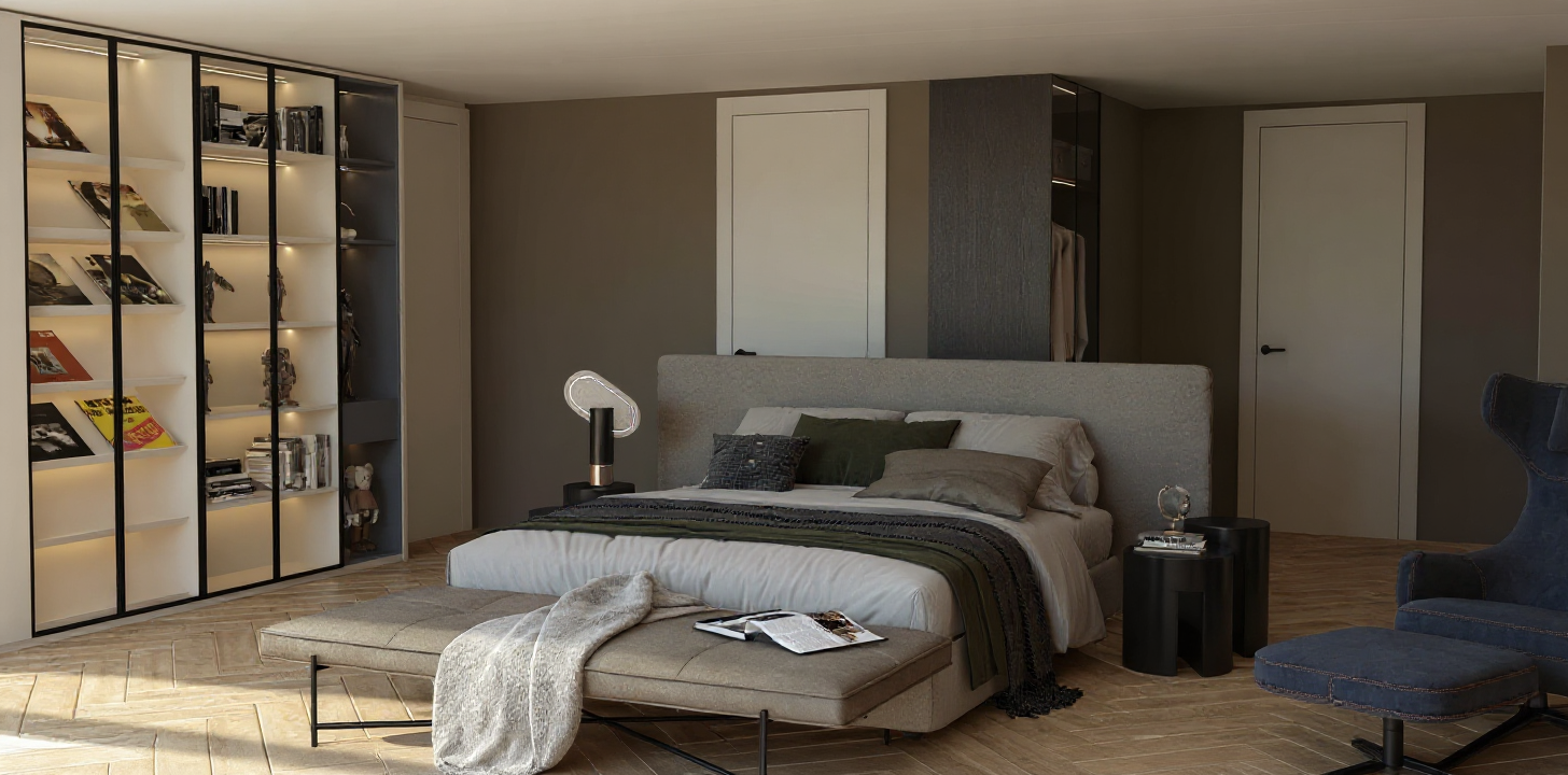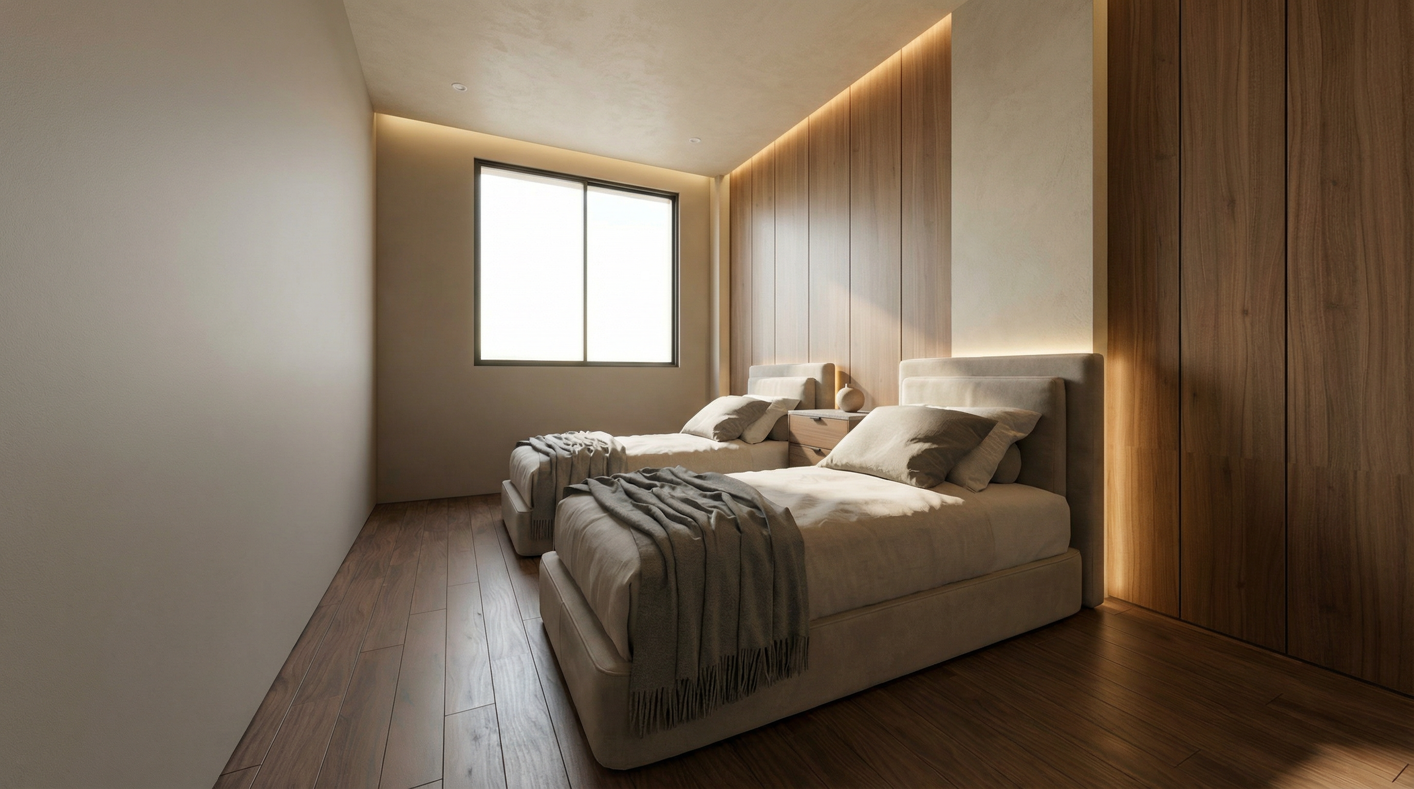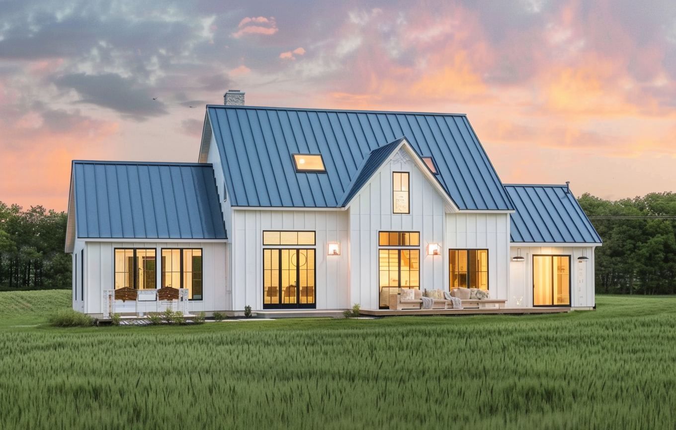 modernist exterior shot render a picturesque countryside house at dusk the house features a clean modern design with a crisp white exterior and a striking blue metal roof warm yellow light glows softly from the windows enriching the welcoming atmosphere surround the house with lush green grass and distant trees framing the scene captivate the sky with a vibrant blend of pink and orange hues reflecting a serene and enchanting sunset enhance the atmosphere with a peaceful and tranquil ambiance architecture