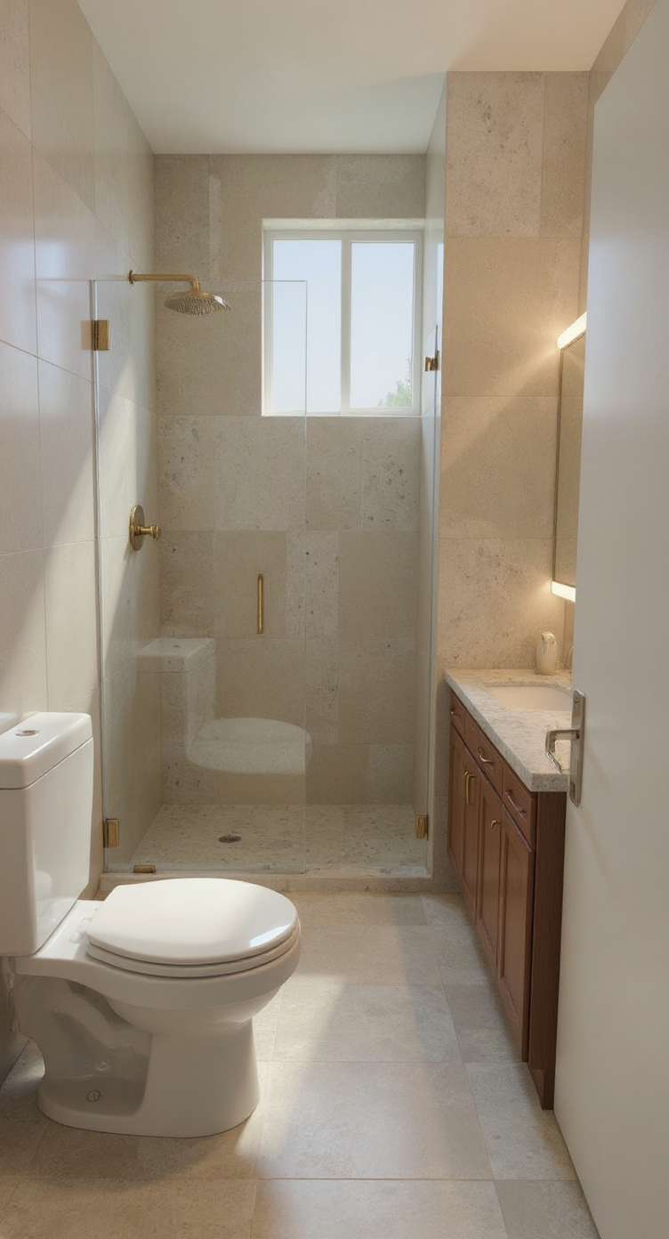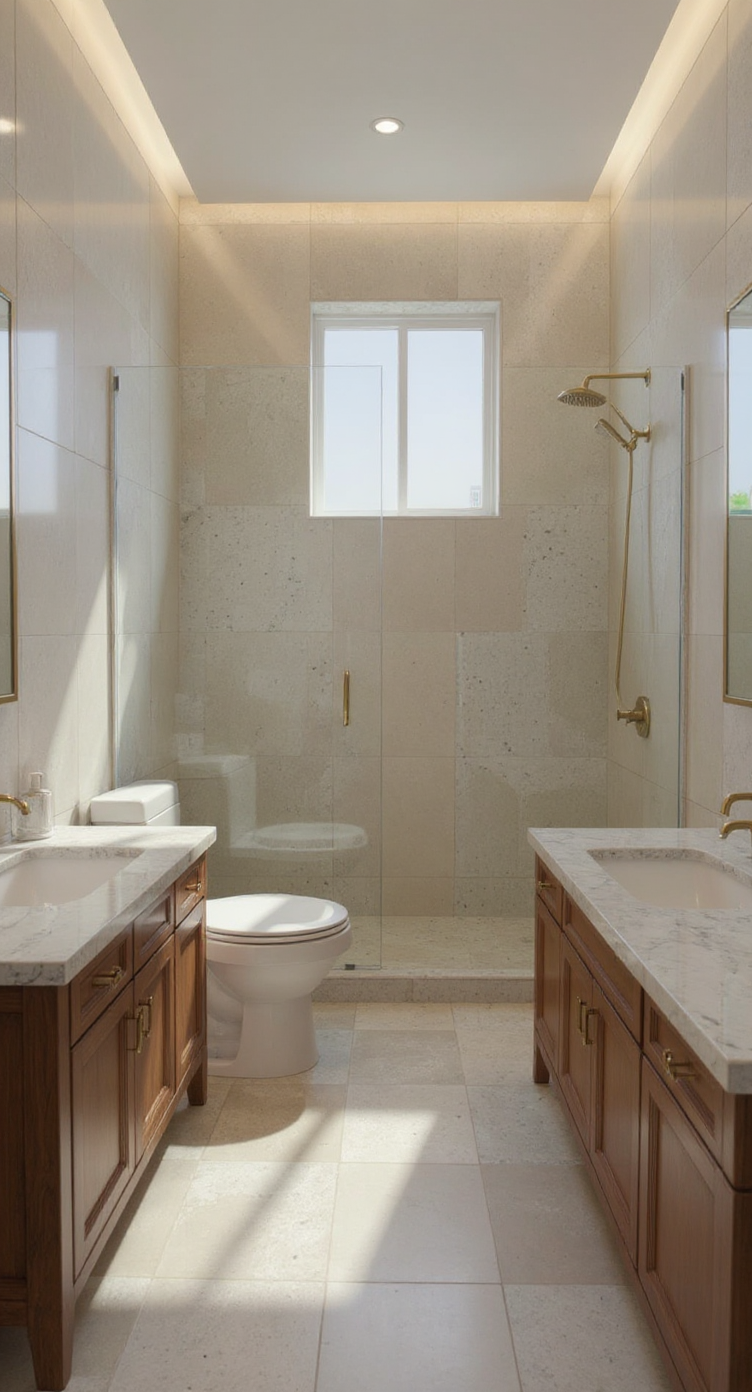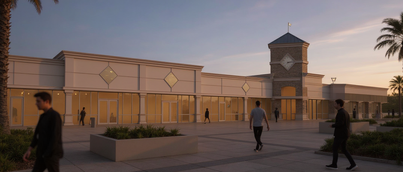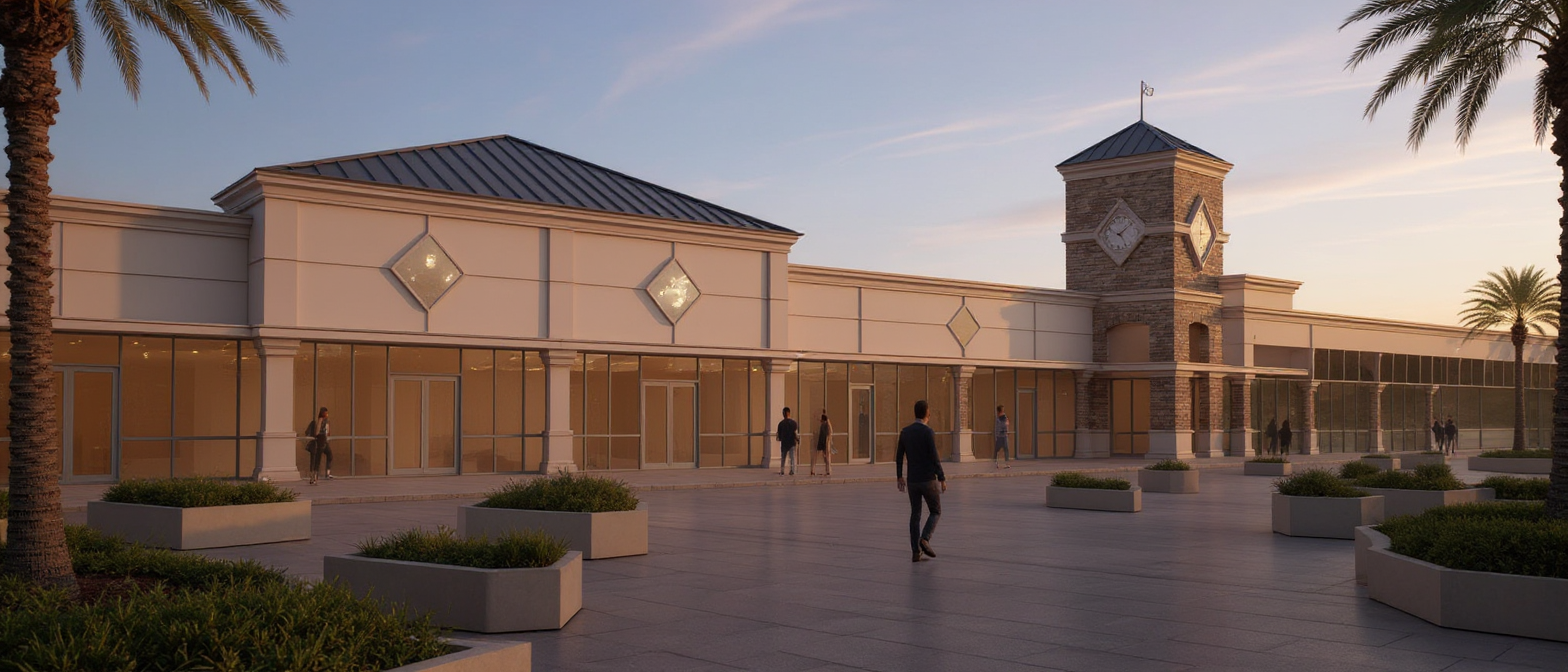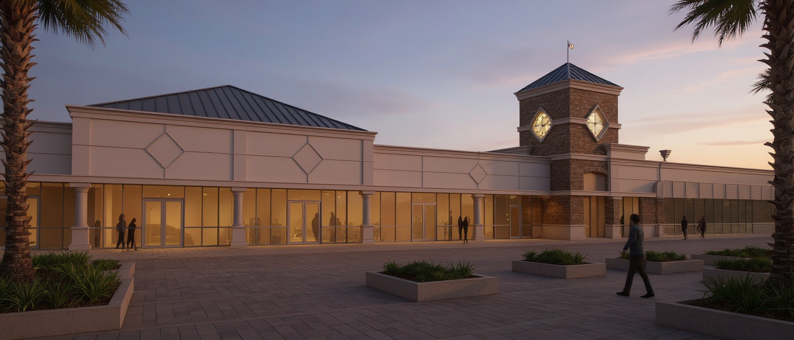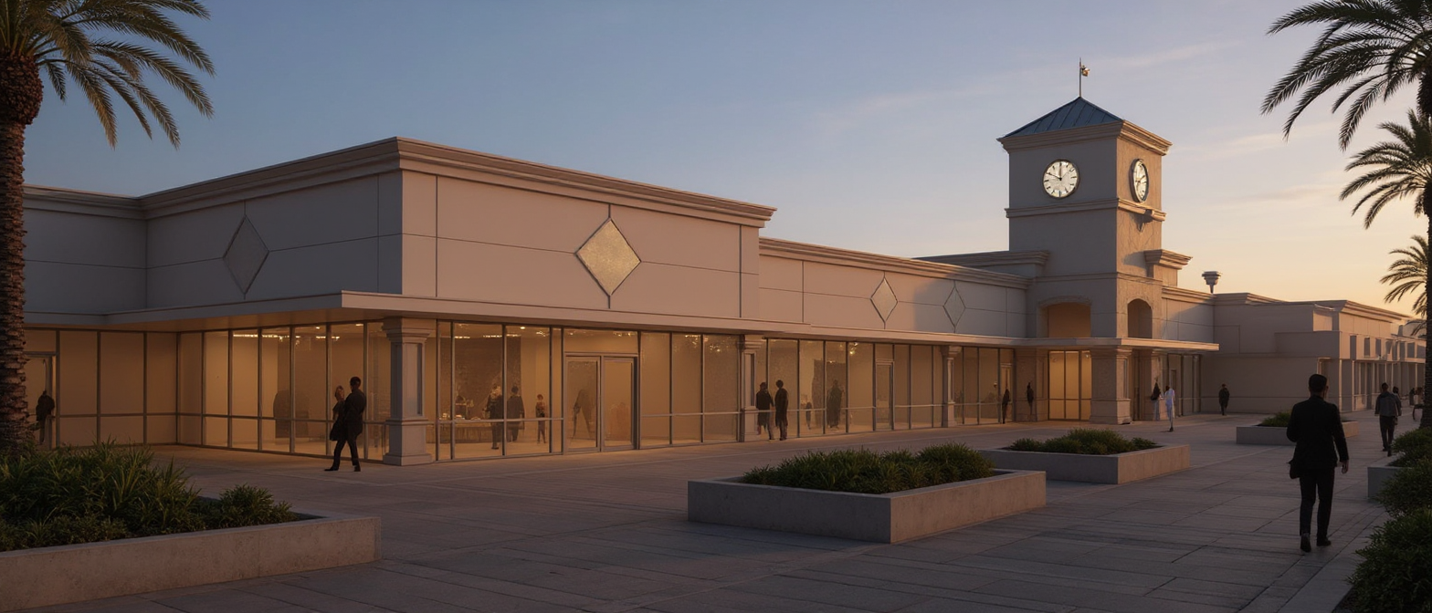 render a modern shopping plaza with a minimalist architectural style the building facade is a sleek combination of glass and steel with a bright white base accentuate the structure with warm beige and light gray tones highlight the windows with reflective glass showing subtle hints of the sky the tower has a clock with soft backlighting and the roof is a modern slate gray add lush green planters with texas coastal palms planting along the walkway set the atmosphere in the golden hour for a warm inviting glow casting long shadows with soft light reflecting off the glass make the scene lively with silhouettes of people walking subtly animated