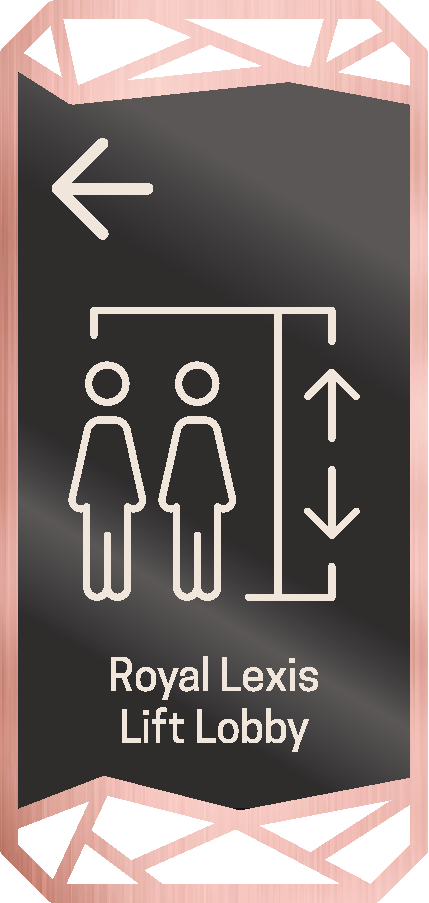 external directional signage size 190mm width x 400mm height elegant proportions featuring messaging icon and arrow in 2mm thick ivory white acrylic with soft backlit glow main messaging panel in black mirror finish reflecting subtle ambient light framed with 10mm thick rose gold stainless steel hairline trim precise craftsmanship and smooth edges mounted on minimalist concrete platform beside pedestrian walkway illuminated by warm ambient lighting realistic reflections and material contrast cinematic night mood uhd photorealistic architectural render
