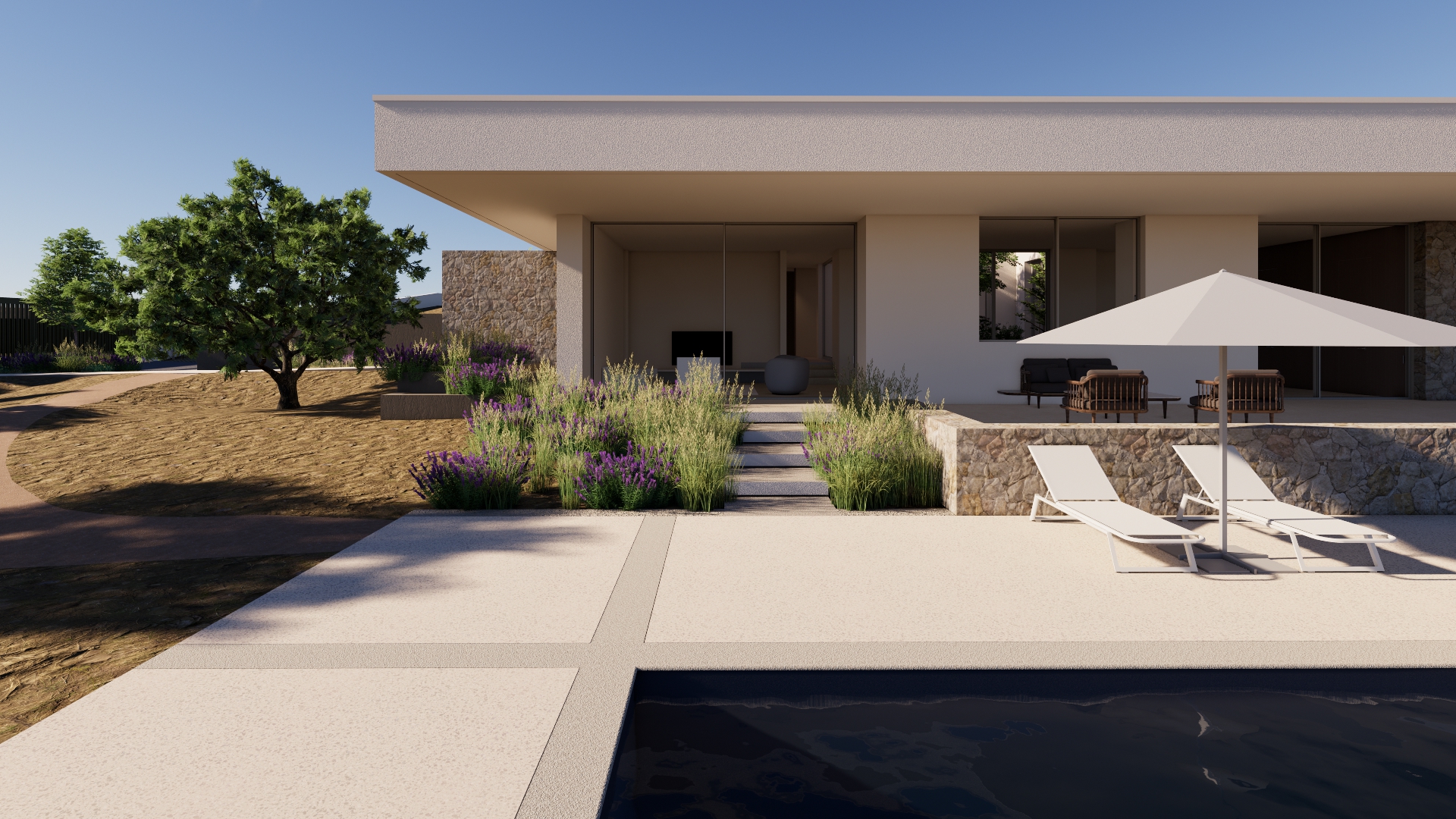 keep the design and the materials of the building as in the picture add olive trees and small bushes with gravel as a sidewalk on the left make the whole image more realistic make the picture not too bright