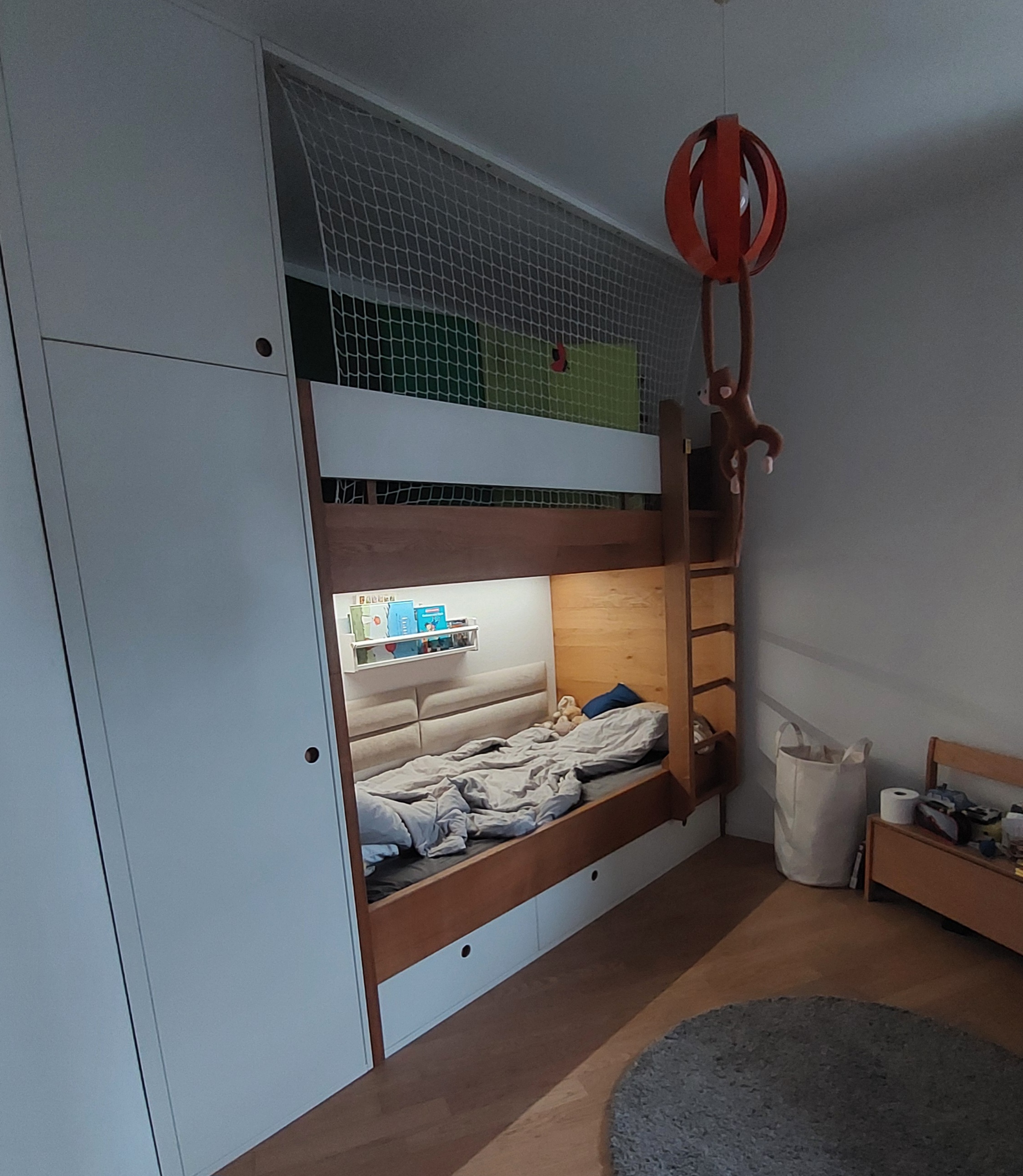 add a black thread curtain in the lower bed area