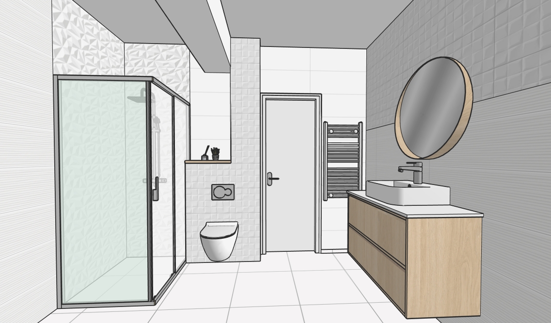 wall materials critical must match references exactly shower enclosure interior left upper area apply white tiles with 3d geometric triangular faceted pattern sharp origami like angular relief creating crystalline surfaces with dramatic dimensional depth and dynamic light shadow play white base with subtle gray shading from the relief structure center column toilet partition wall install square beveled tiles with pillowed 3d effect small white tiles arranged in precise grid pattern each with raised cushioned center and beveled edges creating quilted appearance semi gloss finish extending from floor to ceiling on the central dividing column right wall vanity area split texture design lower half apply horizontal linear wave texture fine parallel grooves running horizontally across white ceramic tiles creating subtle rippled striations with matte finish extending from floor to mid wall height behind vanity upper half continue square beveled tiles with pillowed 3d effect pattern creating textural feature wall behind mirror and visual continuity with center column left wall shower exterior apply horizontal linear wave texture matching the lower right wall treatment back wall behind door smooth white painted surface providing visual rest between textured areas key layout elements left side rectangular glass shower enclosure with clear glass panels and slim chrome metal frame chrome shower column with overhead rain shower mounted on triangular faceted tile interior wall white tiled shower floor center area wall hung white modern toilet with concealed cistern mounted on pillowed tile column rectangular gray dual flush plate integrated into wall small recessed shelf above toilet with minimal accessories and small plant white interior door with flat panel design and chrome handle white towel radiator with horizontal ladder design mounted beside door right side key differentiator floating vanity cabinet in natural light wood finish oak featuring two large handleless drawers with horizontal reveal lines white countertop supporting rectangular white vessel sink positioned left of center modern chrome single lever faucet large circular mirror with matching natural wood frame mounted on upper pillowed tile section creating warm accent against cool tile backdrop