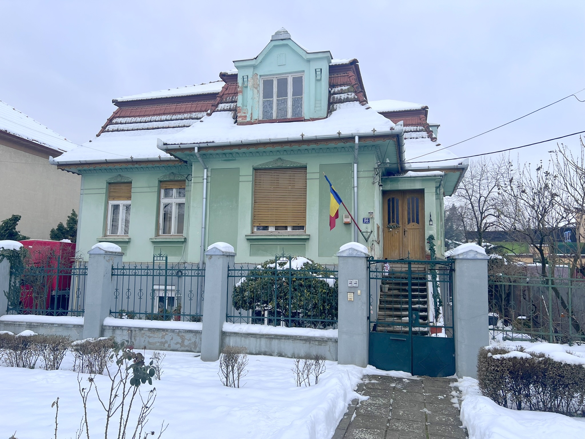 change to light pastel orange ochre grey colors cinematic view more clouds no sun no sun shadows brick coloured roof remove flag remove snow renovate the fence