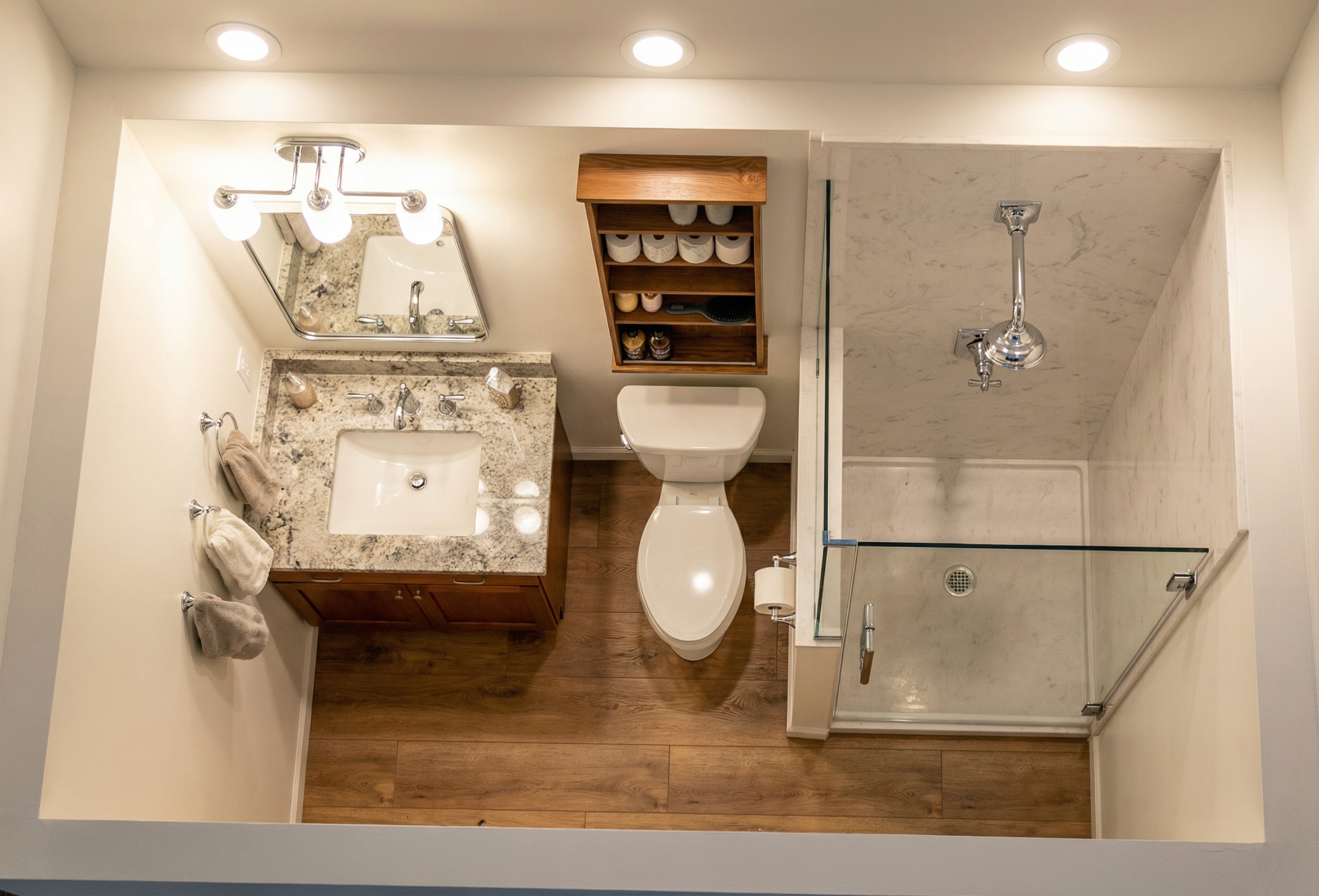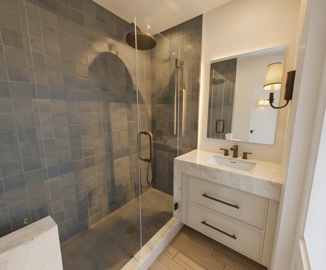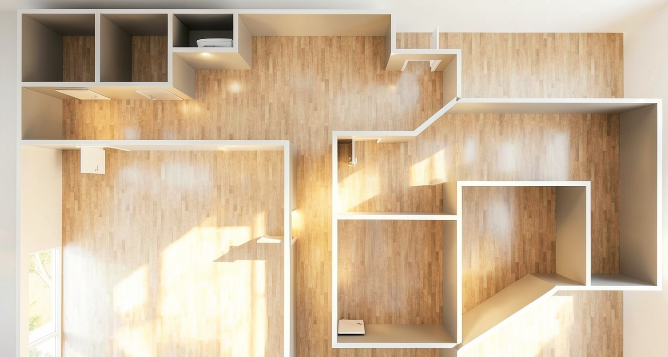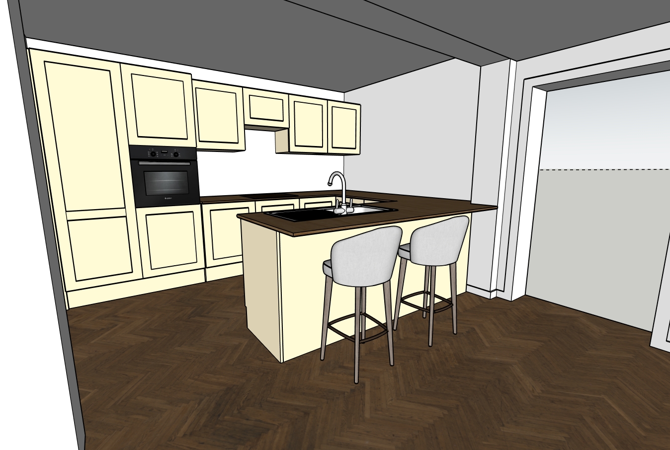 create realistic 3d visualisation of this warm white shake style kitchen with breakfast bar with light oak herringbone flooring with a medium oak worktop