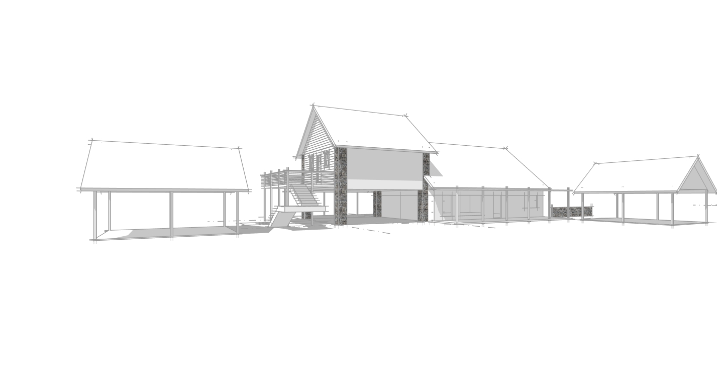 a modern rustic hill country two story house with an a frame roof and expansive balcony the structure features stone pillars in shades of charcoal gray contrasting with the smooth white exterior siding walls and standing metal roof the wooden balcony and stairs are finished in a natural white oak color adding warmth the atmosphere is serene and inviting set against a clear blue sky the ground is covered with lush green grass with soft sunlight casting gentle shadows texas tree line background show birds flying in background