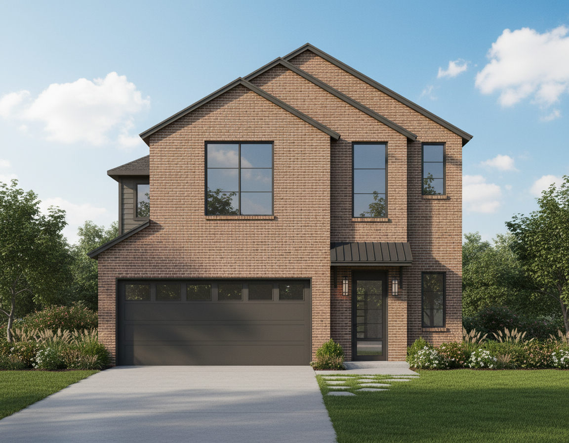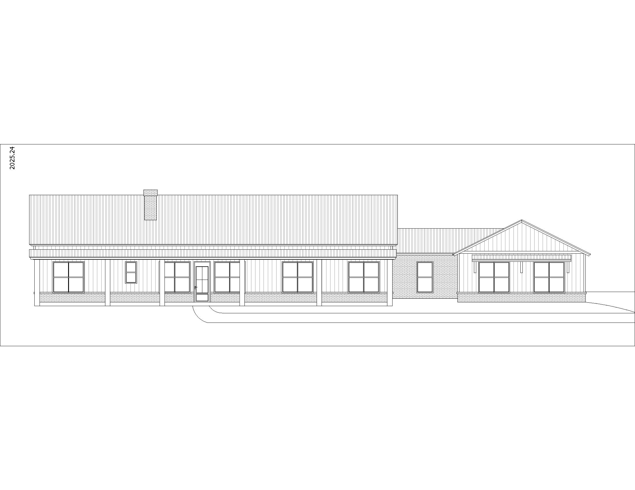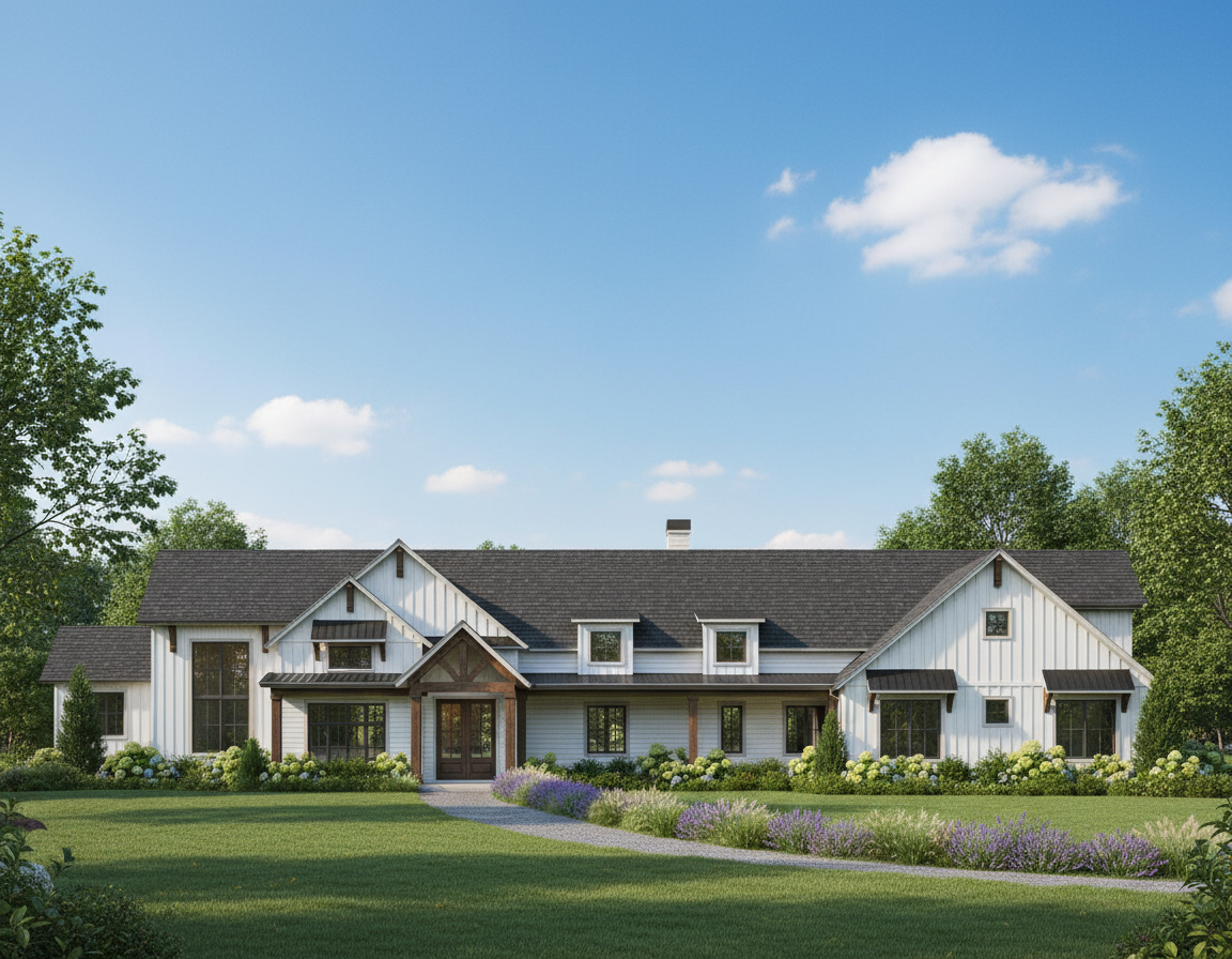 ranch style house country style house with dark roof dark cedar post white vertical board and brick