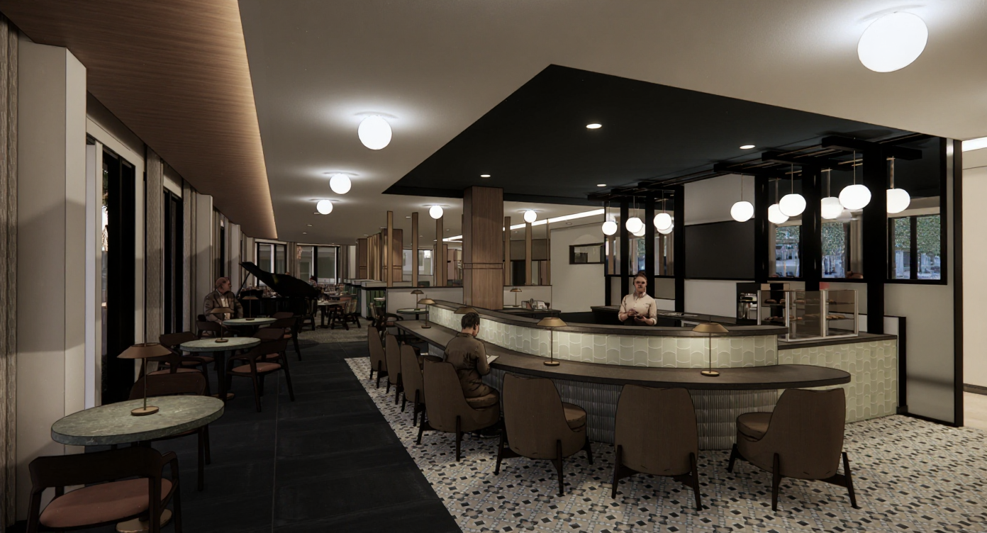 render this view grey stone siding in the middle part add some light in interior sunny day add black mullion between floors add some greens on balcony