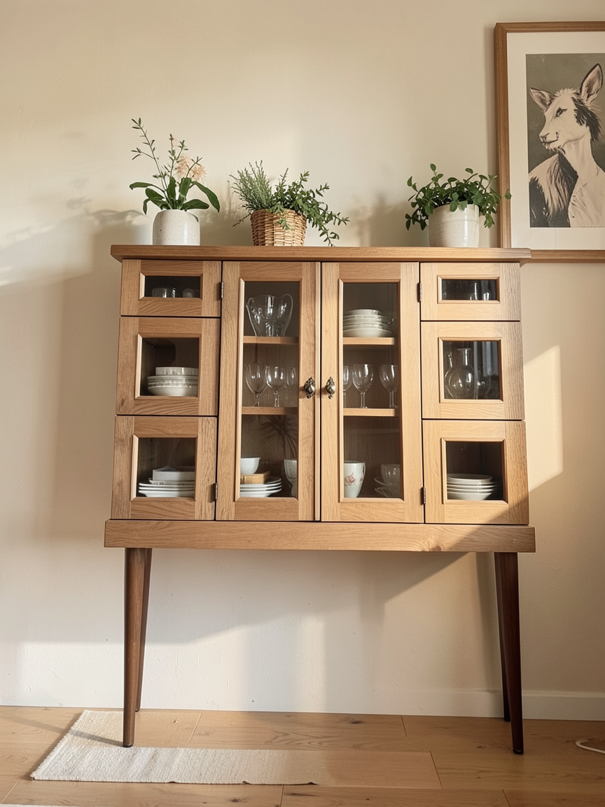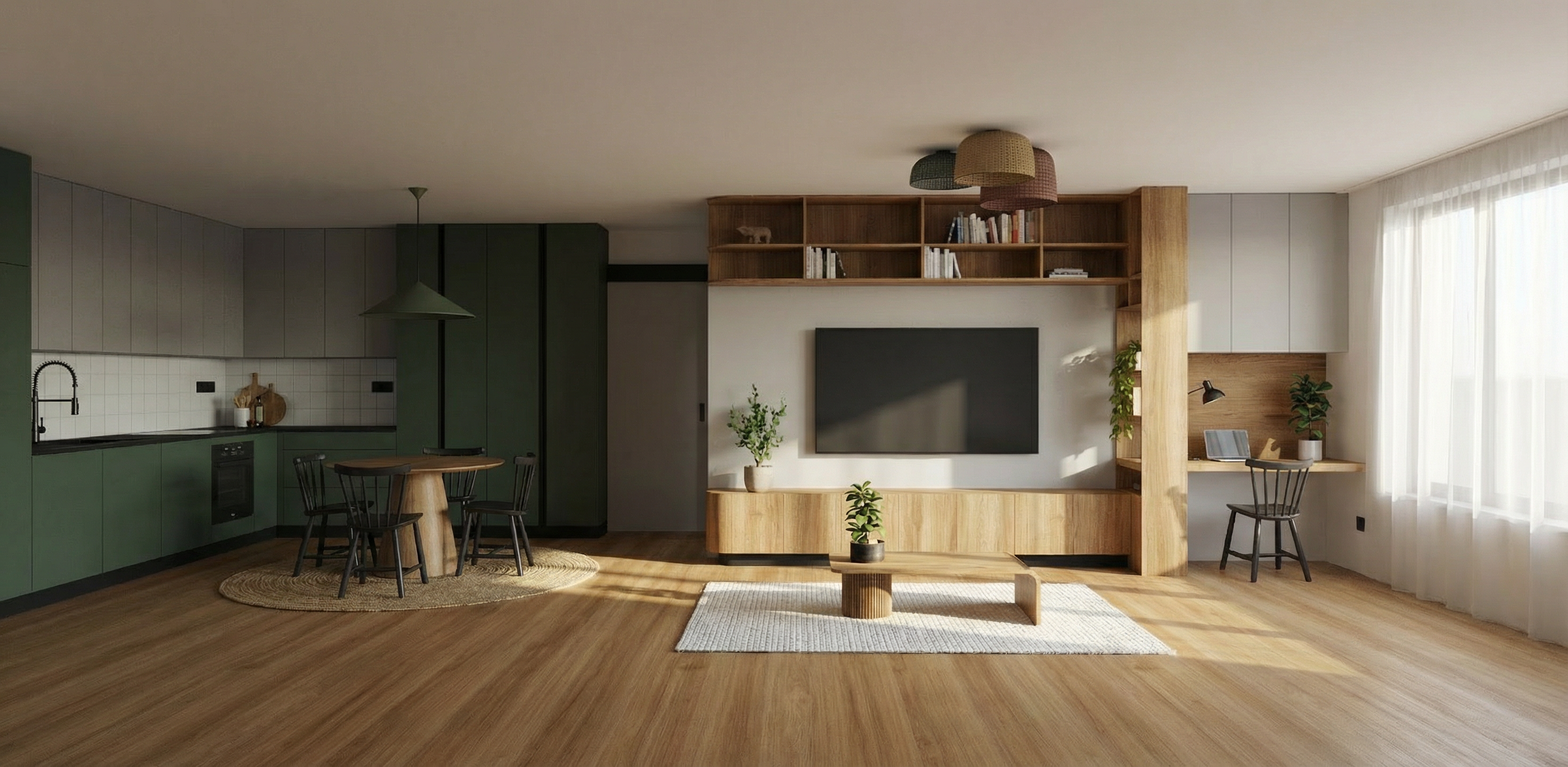 1 g om trie verrouillage absolu tous les volumes proportions positions dimensions et perspectives restent strictement identiques l image source cuisine vier plan de travail caissons portes cadres poteau m tallique four r frig rateur radiateur briques carreaux de verre g om trie totalement verrouill e aucun d placement ajout ou suppression escalier marches en bois limon en m tal g om trie strictement inchang e pas de d gagement ni de double hauteur au dessus de l escalier garde corps simple en m tal dans le style de l escalier salle manger salon volumes positions et proportions des meubles strictement conserv s canap pr sent vu de dos position et orientation identiques l image source structure poutres apparentes conserv es peintes en noir anthracite 2 priorit absolue tous les carreaux blancs cr dence et surfaces carrel es ont des joints peints en bleu visibles entre chaque carreau sans exception portes blanches lisses four correctement repr sent radiateur sous la brique de verre reste blanc 3 mat riaux couleurs caissons cuisine terracotta classique uniforme plan de travail b ton cir tr s clair blanc craie cr me l ments m talliques gris fonc anthracite mat briques carreaux de verre opacifi s et fum s lumi re naturelle chaude diffuse uniquement sans soleil direct ni vue ext rieure poutres noir anthracite 4 objets accessoires tag res hautes bocaux uniquement tag res basses mixeur bouilloire uniquement aucun autre objet ajout 5 clairage 100 lumi re naturelle chaude uniquement via les briques carreaux de verre aucun clairage artificiel aucun rayon direct 6 restrictions aucun ajout suppression ou modification hors l ments explicitement autoris s aucune forme ou d tail parasite