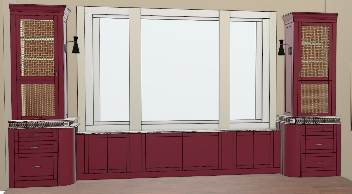 the cabinets are high gloss red the window looks out onto a bay the countertops on the left and right are reeded section sandwiched in between to standard tops