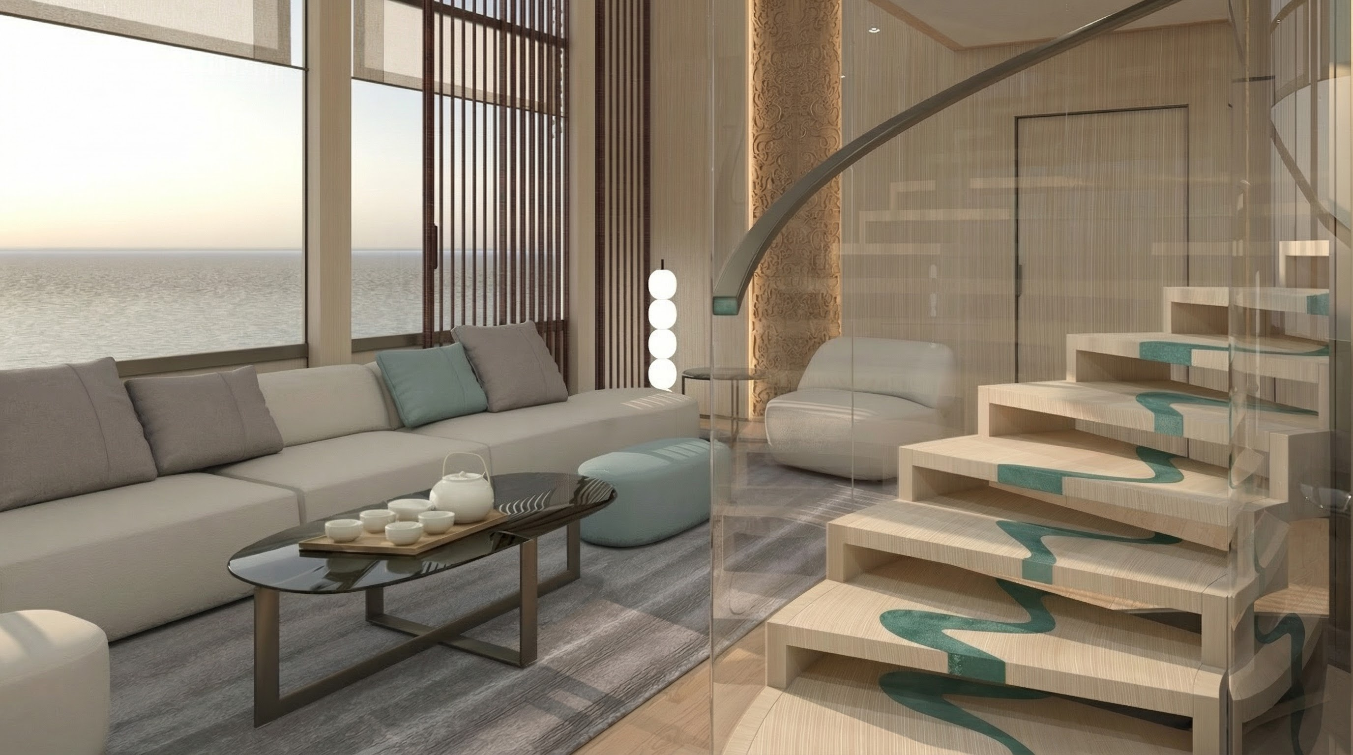 starting from the current displayed rendering exactly as it is do not modify any architecture staircase lighting flooring ceiling or primary furniture such as sofas and chairs remove the small coffee table positioned between the vertical floor lamp and the armchair replace that coffee table only with a tall and refined potted bamboo plant place the bamboo plant naturally on the floor where the coffee table was with the planter at ground level proportionate to surrounding elements do not introduce any additional objects or furniture around it keep the overall materiality lighting and atmosphere unchanged