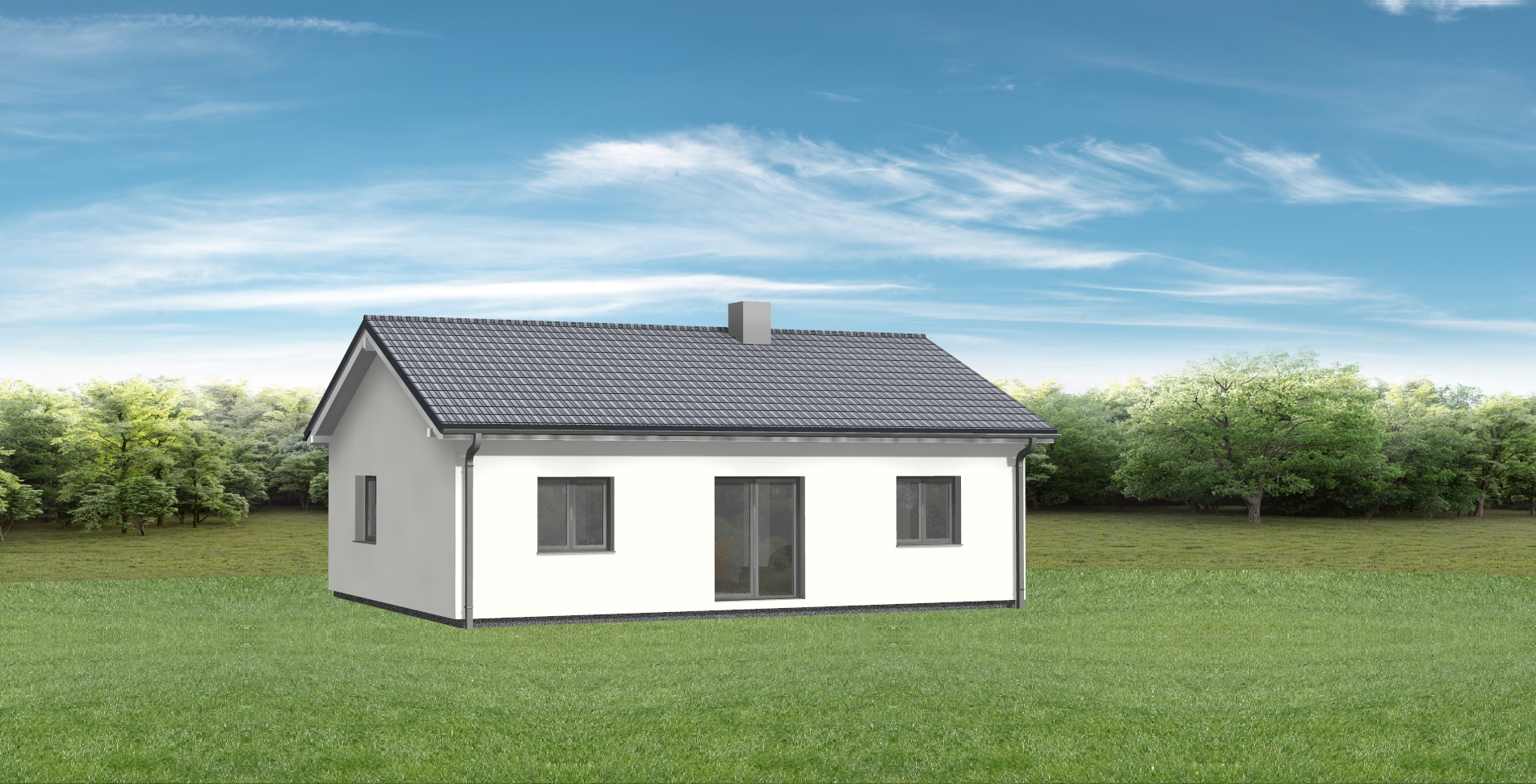 modern minimalist house with a white exterior charcoal gray roof set in a lush green meadow surround with dense verdant forest under a bright blue sky with wispy white clouds the atmosphere is serene and inviting with sunlight softly illuminating the scene trees should be vibrant green enhancing the tranquil natural setting