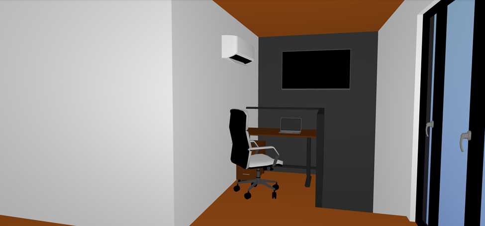 this is the stairwell loft in a smaller modern home the room is located on the second floor of the home with a small office set up in the space a large tv set up on the wall and a mini split ac unit above the office chair beyond the desk is the open space above the stairs the ceiling and floor should be in a walnut plank with the walnut planks going left to right outside the windows to the right should be spruce and pine trees with golden hour lighting