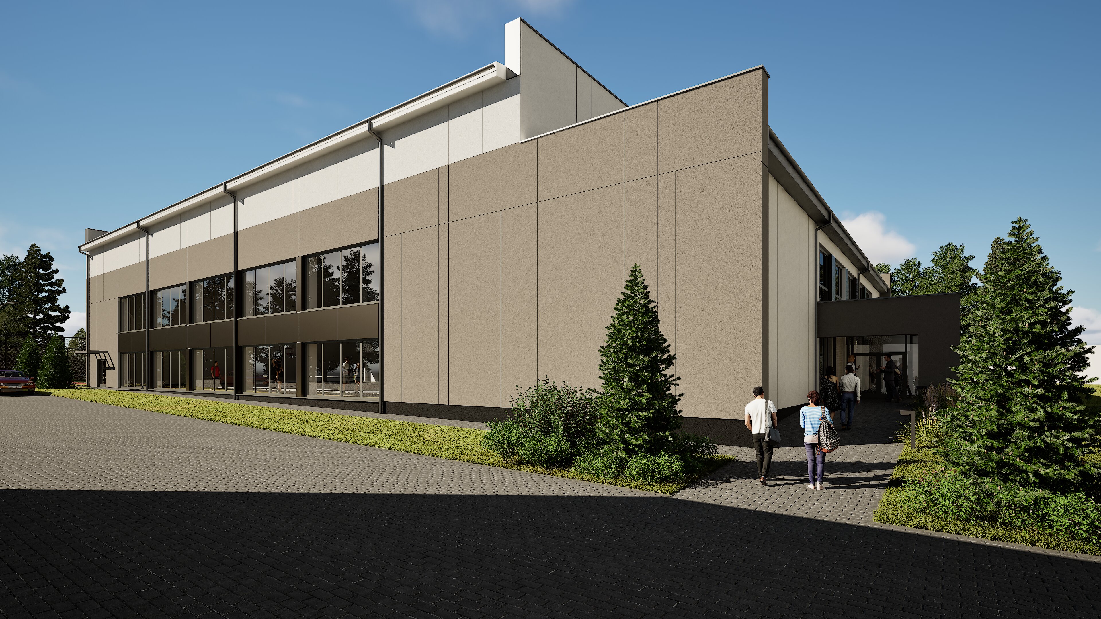 photorealistic outdoor scene of a modern sports hall building realistic architecture large glass panels and metal facade soft natural shadows daylight clean surroundings detailed materials realistic lighting high detail wide angle architectural visualization ultra realistic 8k professional architectural photography style