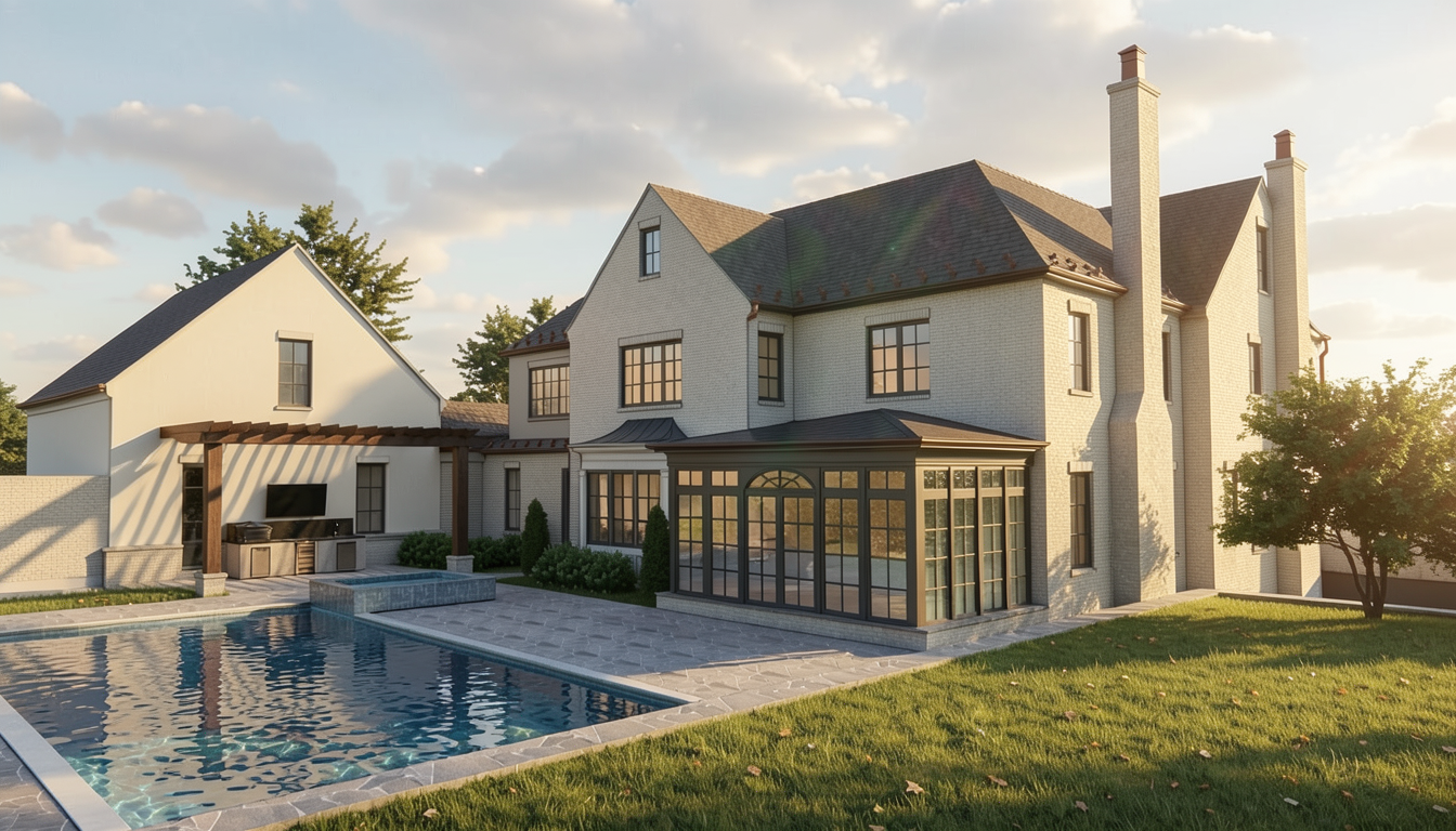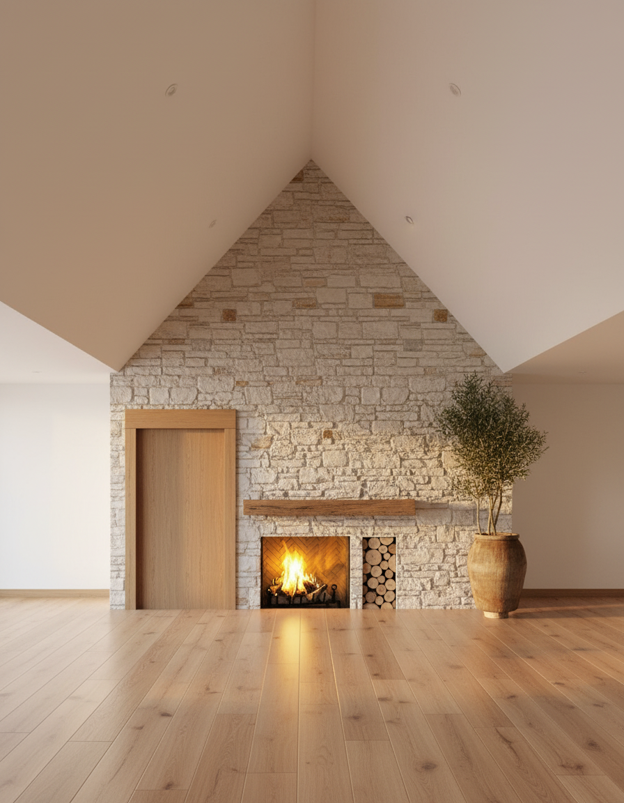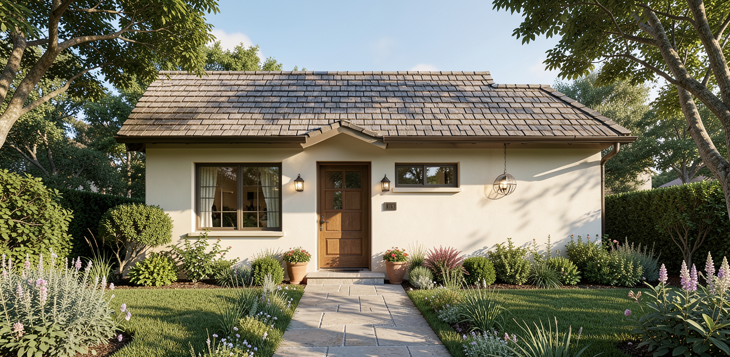 do not change architecture proportions layout windows doors rooflines landscaping or camera angle do not add remove or modify any elements preserve the exact design and composition only enhance realism and material quality as follows refine cedar shingle siding improve natural wood grain definition introduce subtle tonal variation between shingles keep overall colour consistent light warm neutral slightly desaturated avoid yellow orange shift refine thin stone veneer at entry column only increase depth and shadow between stones introduce realistic variation in tone cool grey beige mix sharpen edges and texture for a more natural hand laid appearance improve lighting and rendering quality enhance soft natural shadows especially under eaves and window trims improve ambient occlusion for depth at joints and corners keep lighting direction and time of day unchanged enhance window realism improve glass reflectivity subtly no mirror effect maintain interior warmth without overexposure improve overall image clarity increase sharpness of edges and fine details remove any ai artifacts or blurring maintain a natural photographic look not stylized no colour shifts to overall design no stylistic reinterpretation no added elements