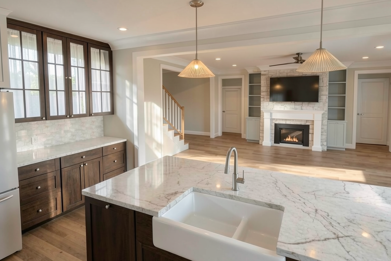 exterior shot brick columns black metal canopy facade horizontal wood grain wood cladding black framed windows and doors