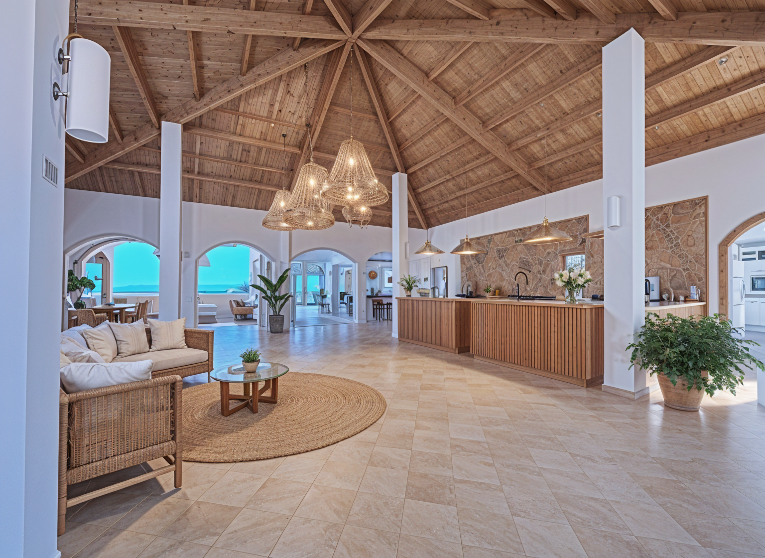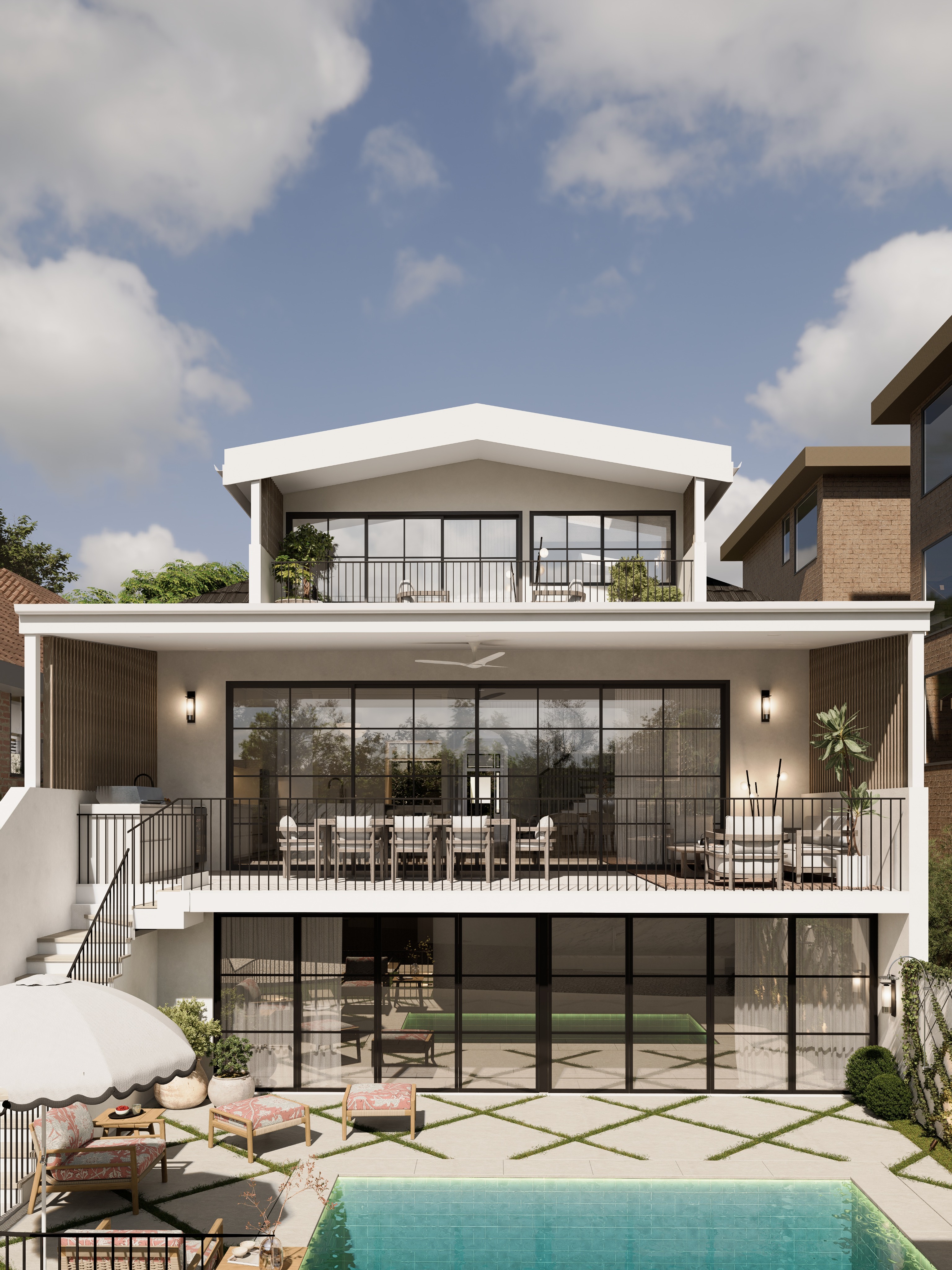 render a modern two story house with a clean minimalist design the house features white walls and large glass windows framed in sleek black capturing a sense of elegance and simplicity surround it with soft greenery to bring life and vibrancy to the atmosphere in front a turquoise swimming pool reflects the house bordered by a patio with light colored tiles and lush green grass patterns poolside add relaxing chairs with soft pastel colored cushions beneath a delicate white umbrella the sky above is clear and blue with fluffy white clouds creating a serene and inviting ambiance capture the warm light of the afternoon sun casting soft shadows enhancing the tranquil and luxurious feel of the scene