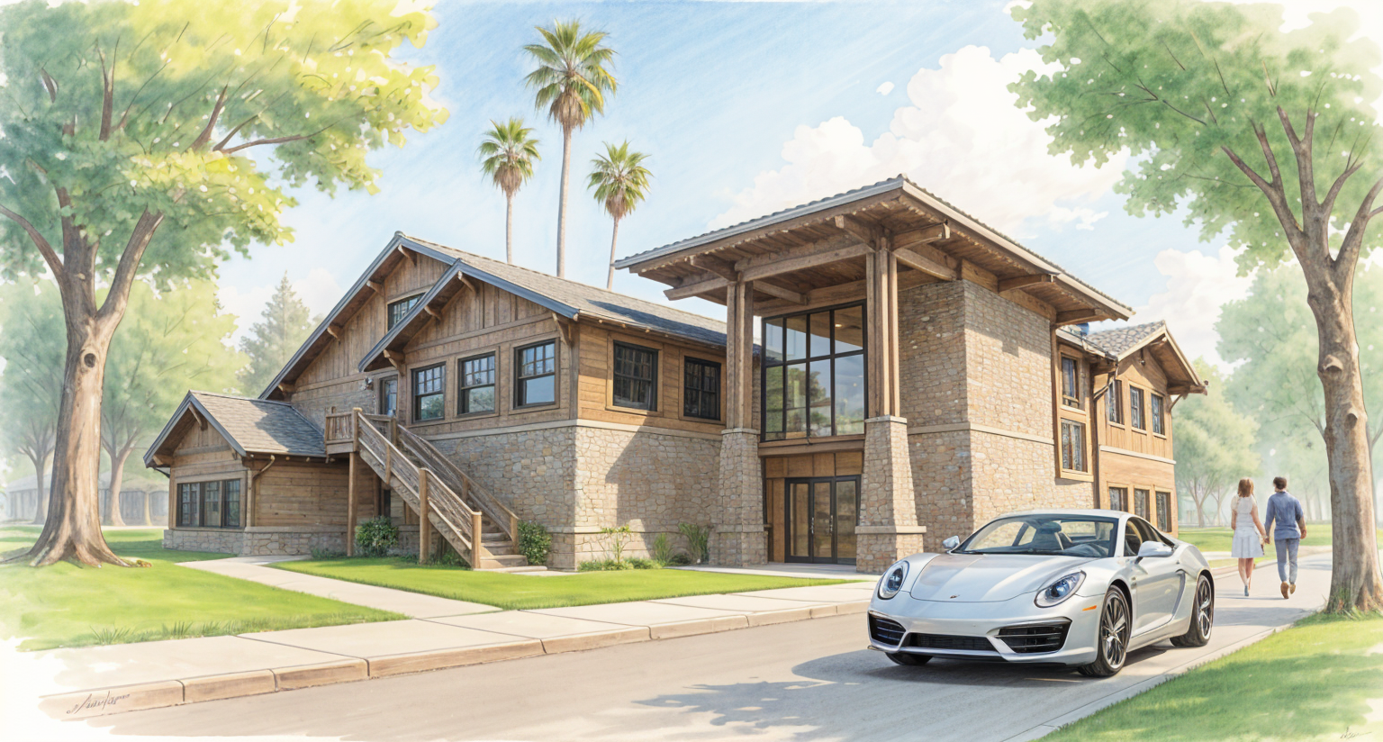 convert to pen sketch and marker color rendering modern finishes on the building extend roof rafter tails out remove tree in front and create a lush landscape with california trees add a accurate 2014 porsche 911 turbo s with air dam on the side in the very far end facing forward add craftsman similar buildings in the background