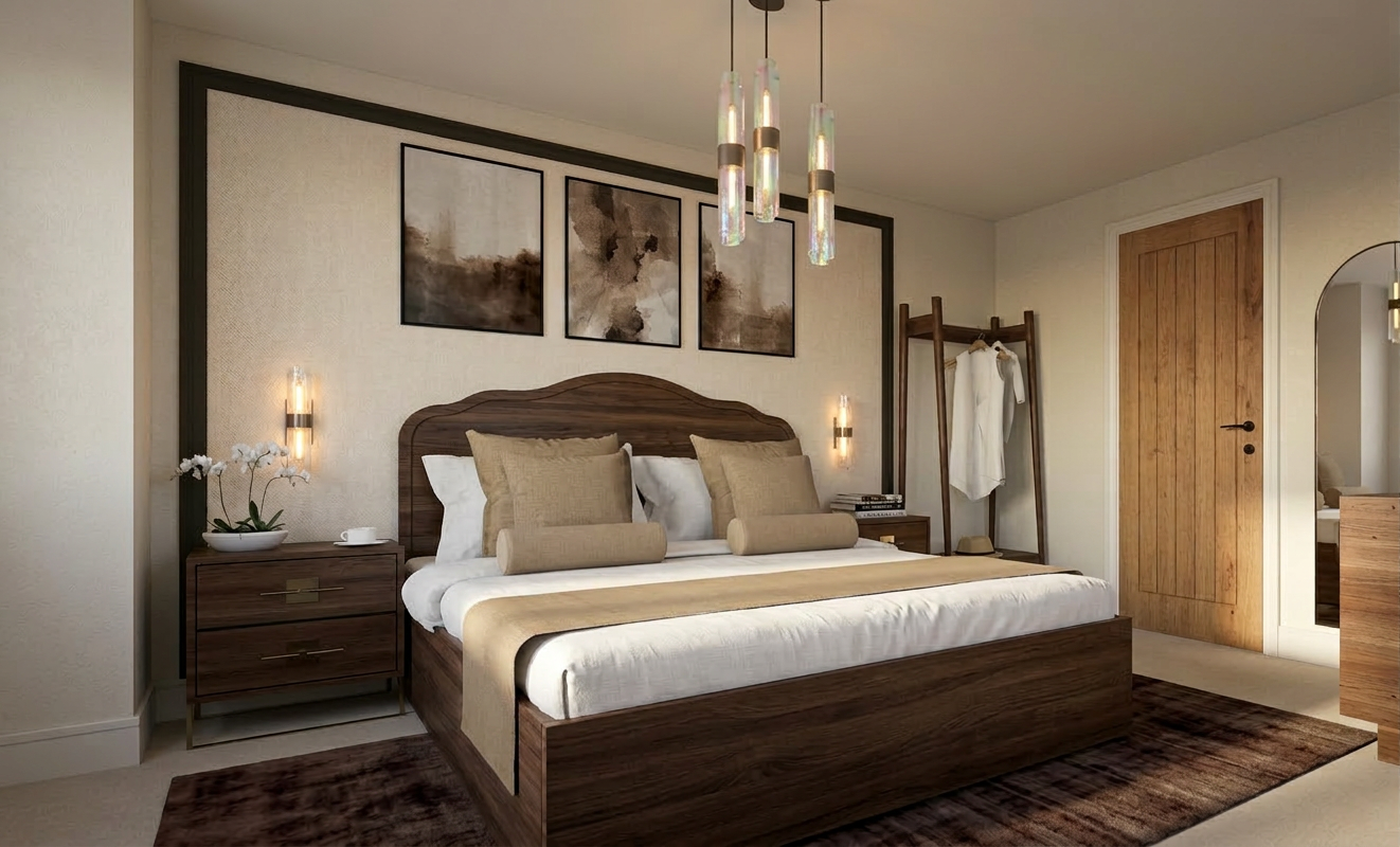 photorealistic rendering of the kitchen keep geometry textures and colors the same as input image keep moldings on top of the hood and cabinets the same as input image glass doors in stacked cabinets on left and right of hood