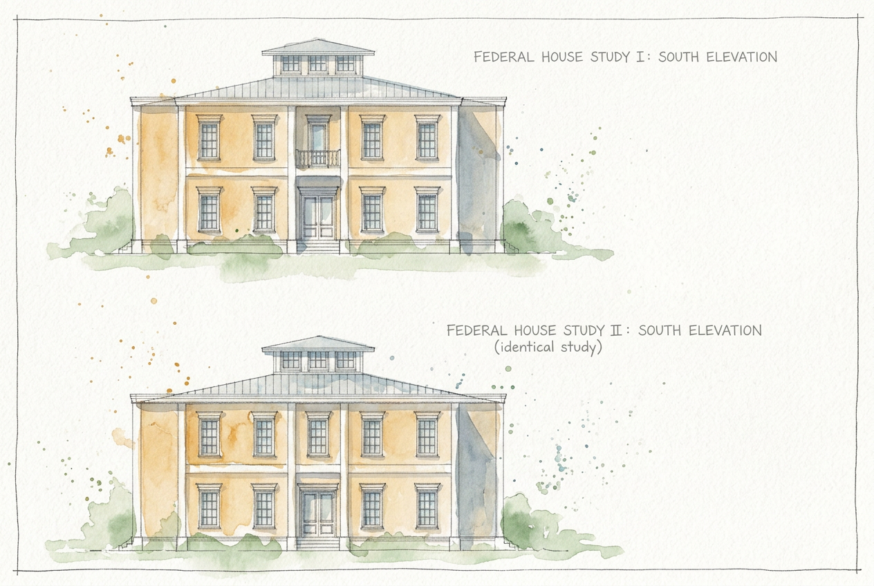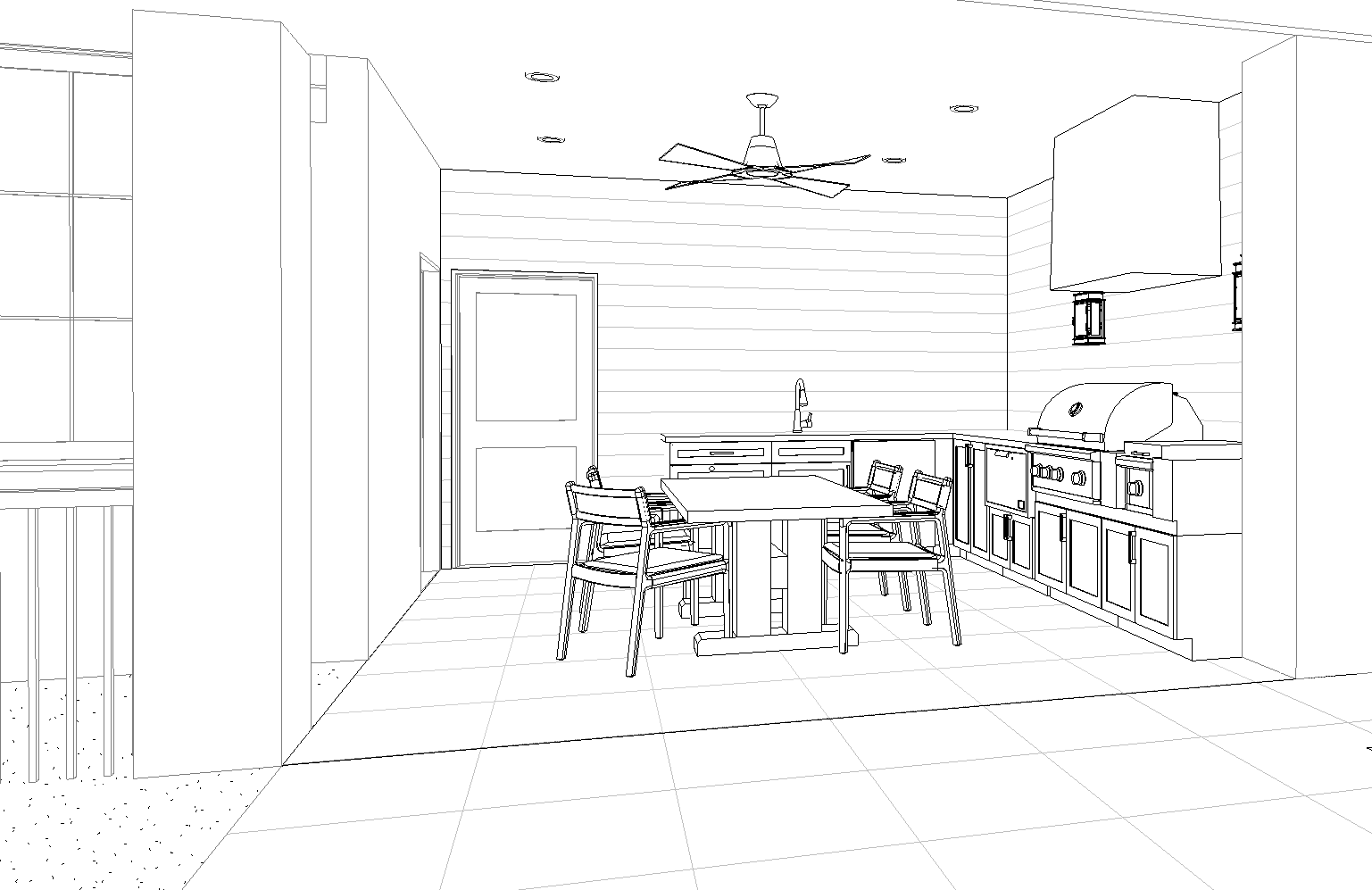 colonial revival exterior shot outdoor grilling area concrete countertops medium tone wood cabinets with brass hardware walls behind are navy blue lap siding with white beadboard ceiling table to be antique farmhouse style table architecture