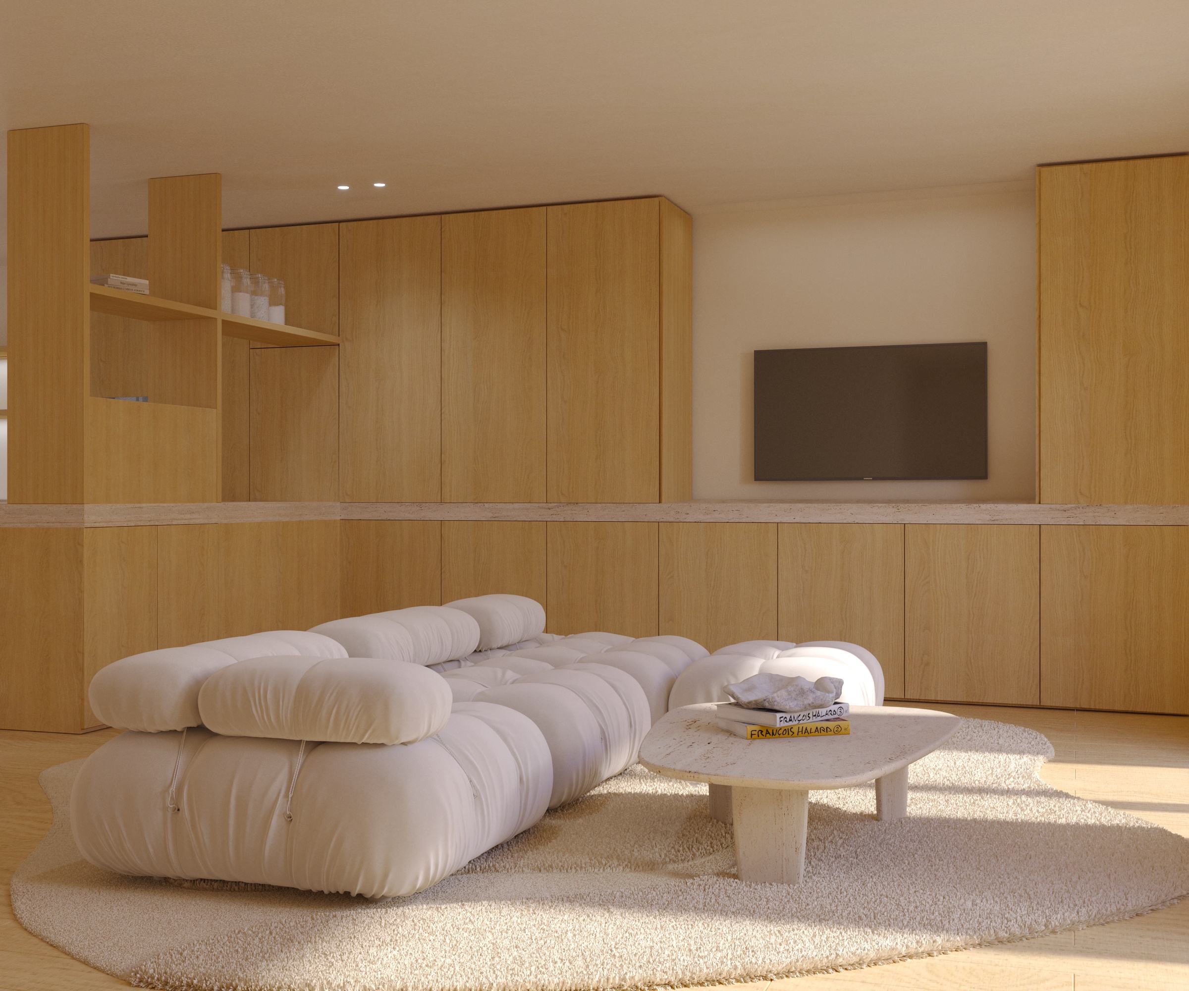 maak een realistische 3d render van een moderne woonkamer zorg dat de belichting natuurlijk en neutraal wit is vermijd gele tinten plaats de tv iets hoger aan de muur voor een betere kijkhoogte kleed de ruimte gezelliger aan vooral rond de zetel voeg zachte kussens een plaid en warme texturen toe gebruik andere decoratie op de salontafel zoals een designboek een kleine vaas met bloemen of een geurkaars vervang het tapijt door een ander exemplaar dat hoog en laagpolige structuren combineert in een subtiel modern patroon zorg dat de materialen hout stof metaal fotorealistisch gerenderd zijn met correcte schaduwen en reflecties compositie in een lichte uitnodigende sfeer met een focus op balans en comfort