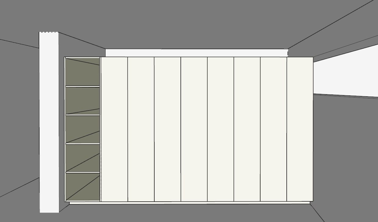 interior rendering instructions interior space with light colored wooden parquet flooring laid in a 45 degree herringbone pattern smooth elegant white walls with a refined finish including a white smooth guardapolvo to maintain a clean and minimalist look custom built in furniture featuring a niche made of golden cypress melamine masisa and flat handle less doors in white melamine creating a calm and contemporary contrast the niche is styled with books framed photos and indoor plants following a scandinavian aesthetic the ceiling includes one short linear track lighting each track fitted with two white spotlights providing soft controlled illumination the window glass must be clearly visible with subtle reflections exterior lighting is reduced to a soft morning light with gentle daylight and partially visible tree branches outside creating a serene and natural atmosphere