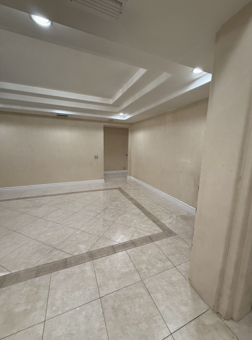remove furniture remove table and chandelier remove mirrored cabinet on right side wall change floor to simple tile make the tile more simple and plain great now remove artwork on the right hand wall now change to black and white scale make black and white great now make image black and white scale change tile into simple tile make tile simple and clean