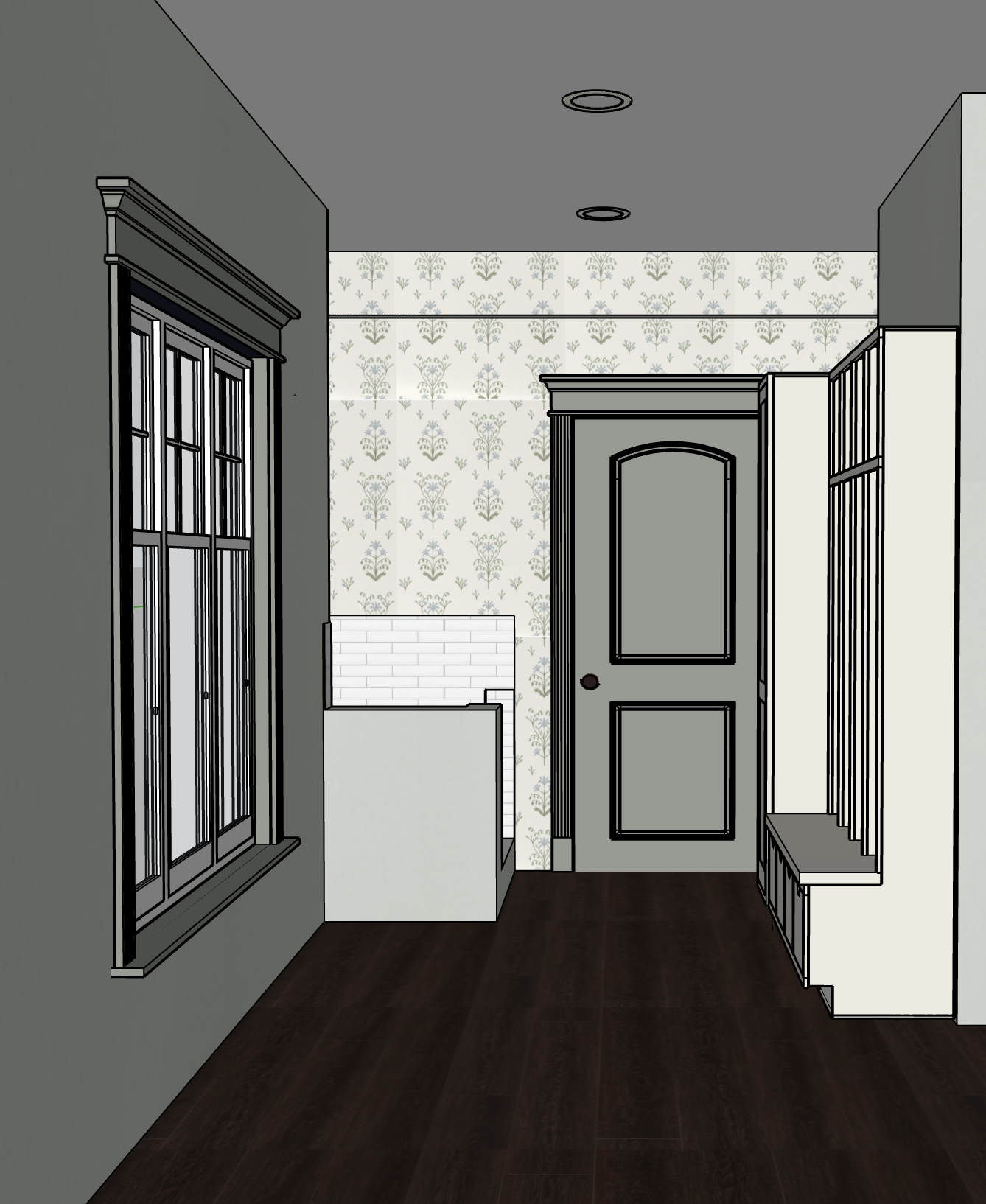 render with indirect midday natural light from window render with 25 recessed light wall color is sherwin williams sea salt door and all trim is sherwin williams oyster bay wallpaper is as shown keep cabinets an off white color