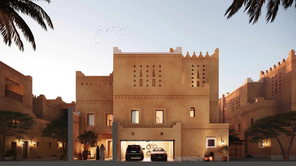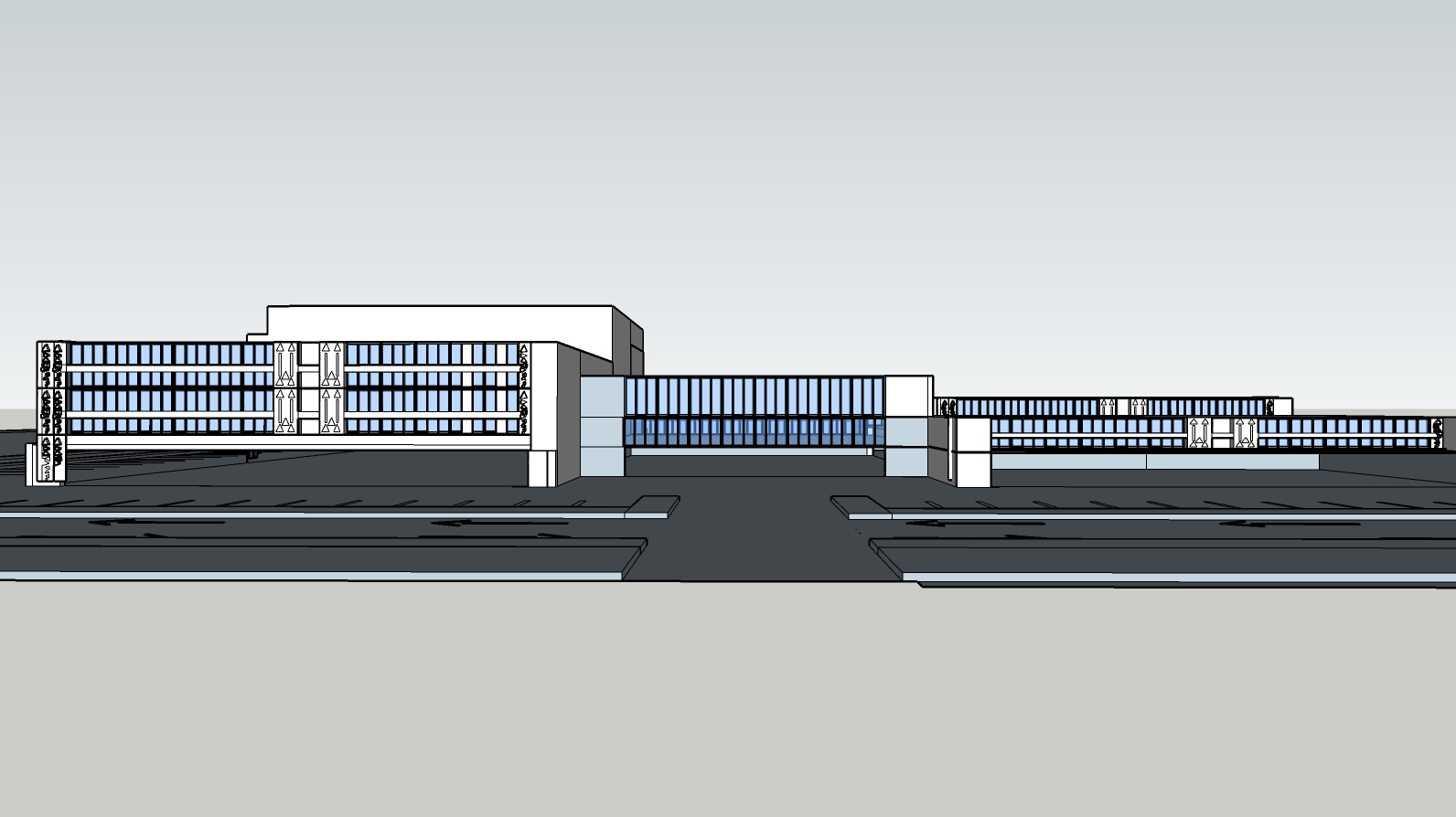 aerial shot an office complex with ground level parking lots upper levels for offices facade is a mix of glass windows engraved patterns and facade materials are a mix of beige shades with wooden finishes and hidden lights the buildings are surrounded by landscape and walking spaces as well as streets for cars to surround it
