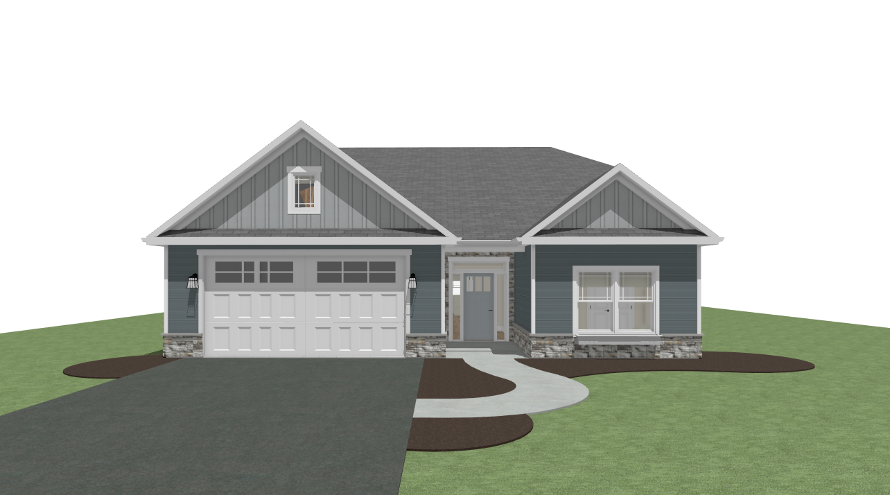 create a photorealistic rendering of a house using the original image all structural features including rooflines windows doors and exterior materials must remain exactly as shown do not modify any architectural elements enhance the image by adding photorealistic front yard landscaping lush green grass flower beds with color variety low shrubs and an inviting path to the door keep lighting natural and the home fully visible add a realistic row of mature trees behind the house to create a tree lined property ensure scale shadow and lighting match the scene trees should complement the setting without covering any portion of the home